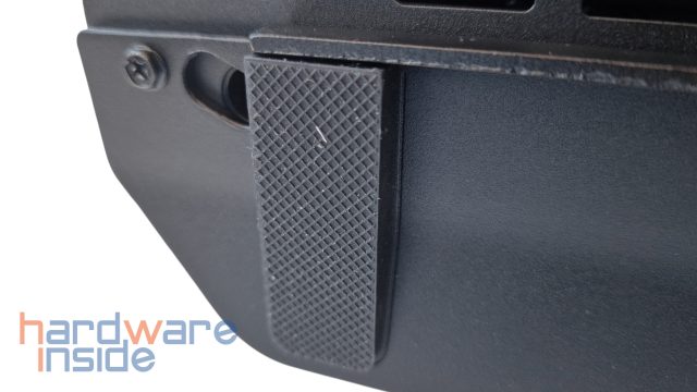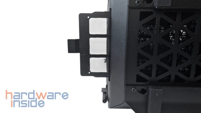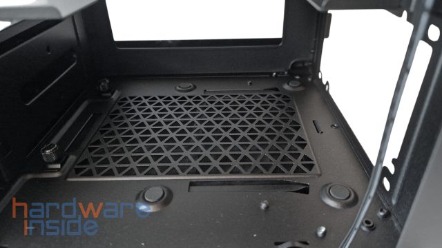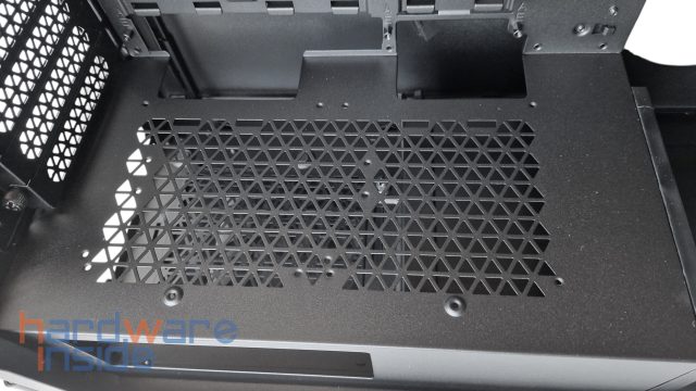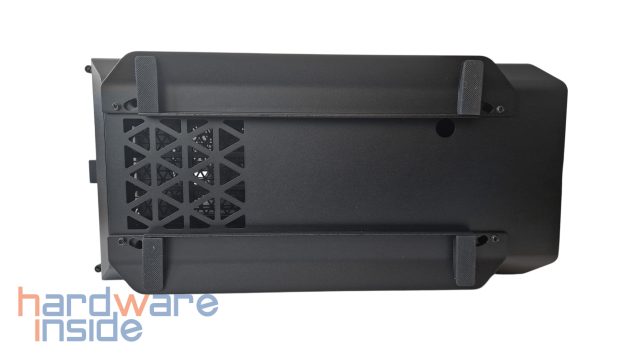 Neben dieser Öffnung sehen wir ein wabenförmiges Gitter, wo ein 120 mm Lüfter verbaut werden kann. Unterhalb des Deckels ist ein weiteres Lüftergitter eingefügt, daraus lässt sich schließen, dass auch der Support von Radiatoren im Innenraum eingeplant ist. Seitlich, rechts neben dem Mainboard-Tray befindet sich ein länglicher Stab, der auf der Rückseite durch eine Schraube gelöst werden kann. Dieser dient in Kombination mit dem beiliegenden Halter als Unterstützung für die Grafikkarte, sofern diese eine Länge von mehr als 330 mm aufweist. Zahlreiche Modelle – einschließlich unserer Test-Grafikkarte – weisen eine unzureichende Länge auf.