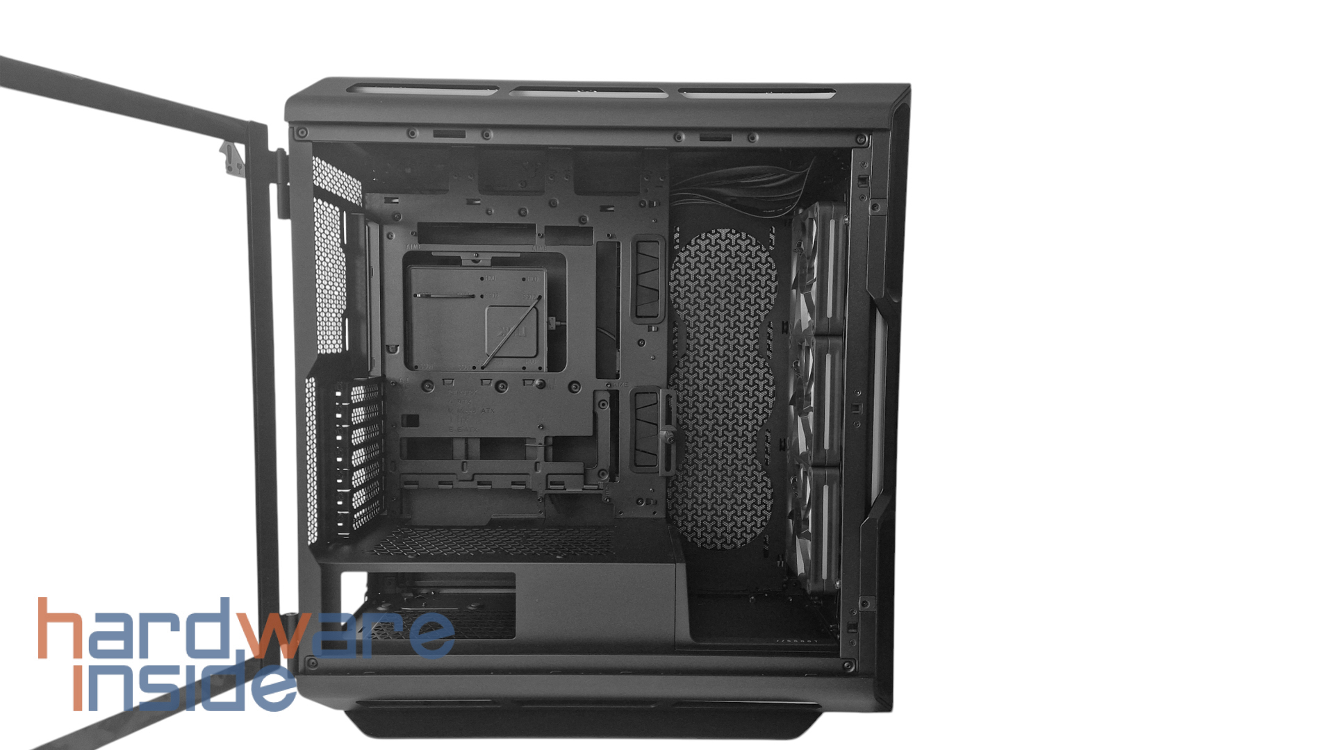 Kommen wir zum Herzstück – dem Innenleben. Der Innenraum ist in zwei Kammern unterteilt. Im oberen Bereich, wo sich das Mainboard-Tray befindet, ist barrierefrei, also ohne Laufwerkskäfige oder ähnliche Aufbauten. Rechts davon befinden sich Kabeldurchführungen mit Gummiabdeckungen. Vor diesen ist standardmäßig eine Blende angebracht, hinter der Platz für die Montage von drei 120-mm-Lüftern oder einem maximal 360 mm großen Radiator ist. Zudem gibt es großzügige Kabeldurchführungen über und unter dem Mainboard-Tray.