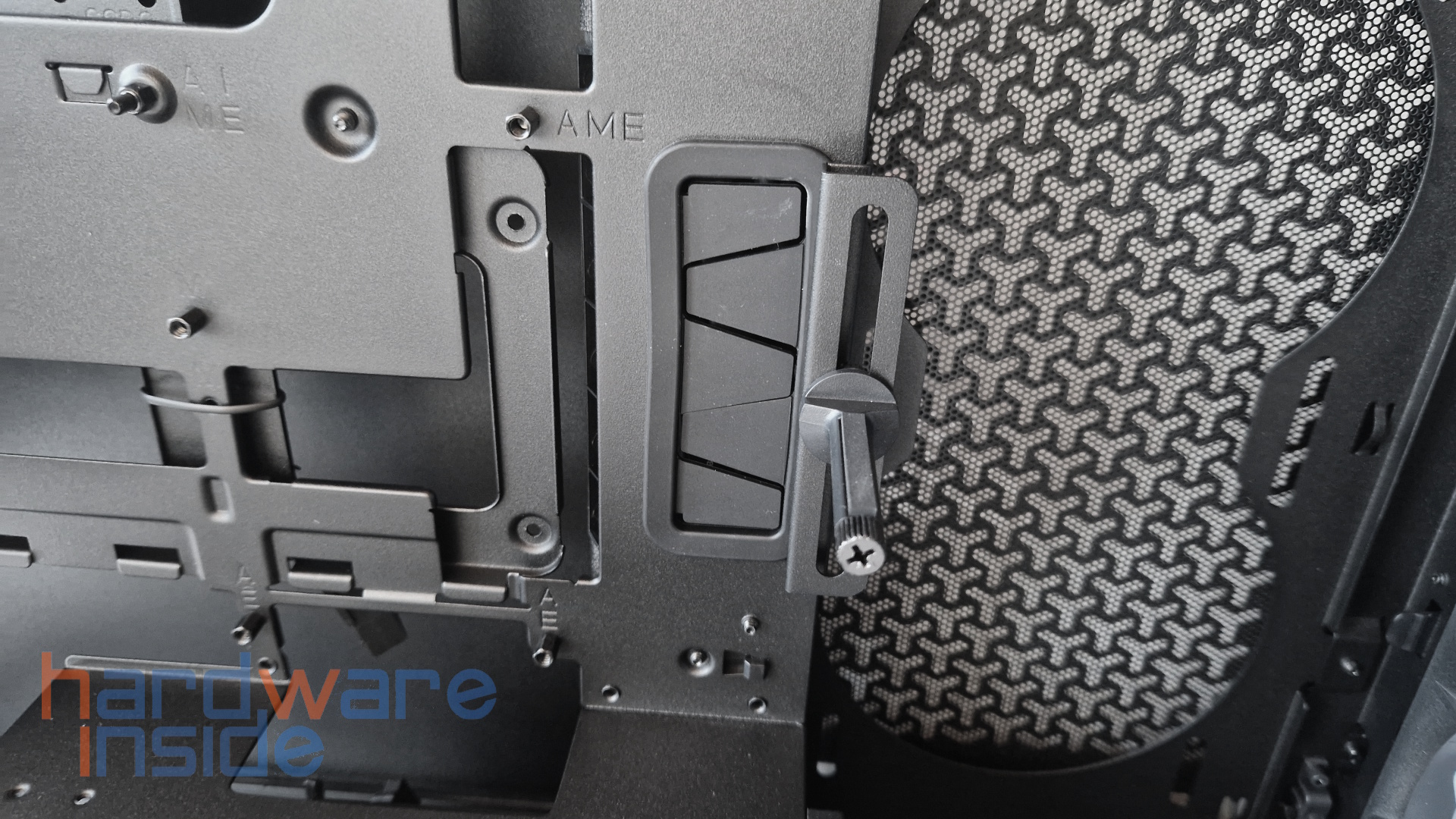 Neben dieser Öffnung sehen wir ein wabenförmiges Gitter, wo ein 120 mm Lüfter verbaut werden kann. Unterhalb des Deckels ist ein weiteres Lüftergitter eingefügt, daraus lässt sich schließen, dass auch der Support von Radiatoren im Innenraum eingeplant ist. Seitlich, rechts neben dem Mainboard-Tray befindet sich ein länglicher Stab, der auf der Rückseite durch eine Schraube gelöst werden kann. Dieser dient in Kombination mit dem beiliegenden Halter als Unterstützung für die Grafikkarte, sofern diese eine Länge von mehr als 330 mm aufweist. Zahlreiche Modelle – einschließlich unserer Test-Grafikkarte – weisen eine unzureichende Länge auf.