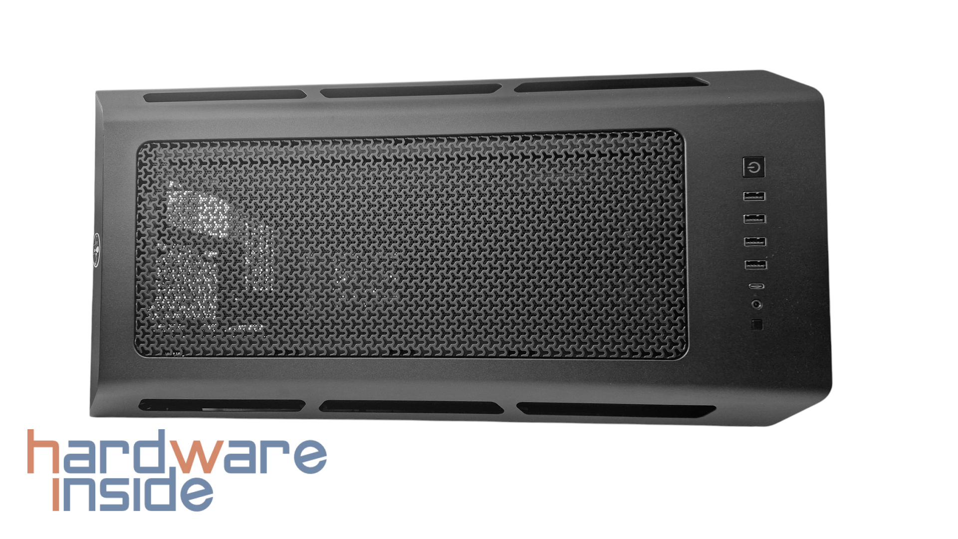 Im vorderen Bereich des Deckels ist das I/O-Panel untergebracht. Hier befinden sich von links nach rechts die Reset-Taste, ein Kopfhörer-/Mikrofon-Kombianschluss, ein USB-3.2-Gen-2-Typ-C-Anschluss, vier USB-3.2-Type-A-Anschlüsse (1. Gen.) sowie der Power-Button.