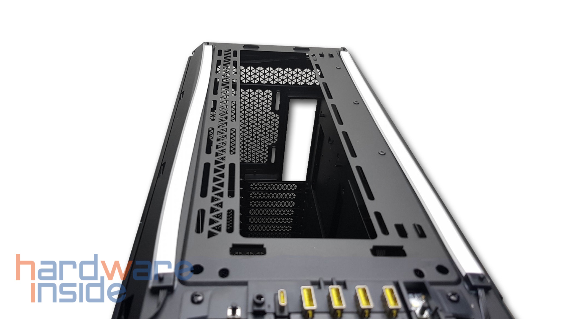 Auch auf der Oberseite setzt sich das schlichte und markante Design fort. Um den Deckel zu entfernen, befindet sich rückseitig eine Mulde. Mit einem leichten Ruck wird diese gelöst und kann entnommen werden. Links und rechts daneben sind ebenfalls zwei ARGB-Lichtstreifen zu sehen. Darunter befindet sich die Montagemöglichkeit für weitere Lüfter oder einen Radiator mit max. 360 mm. Ist die Abdeckung entfernt, hat man Zugriff auf ein weiteres abnehmbares Mesh-Gitter, das auch hier mit Magneten an seinem Platz gehalten wird.