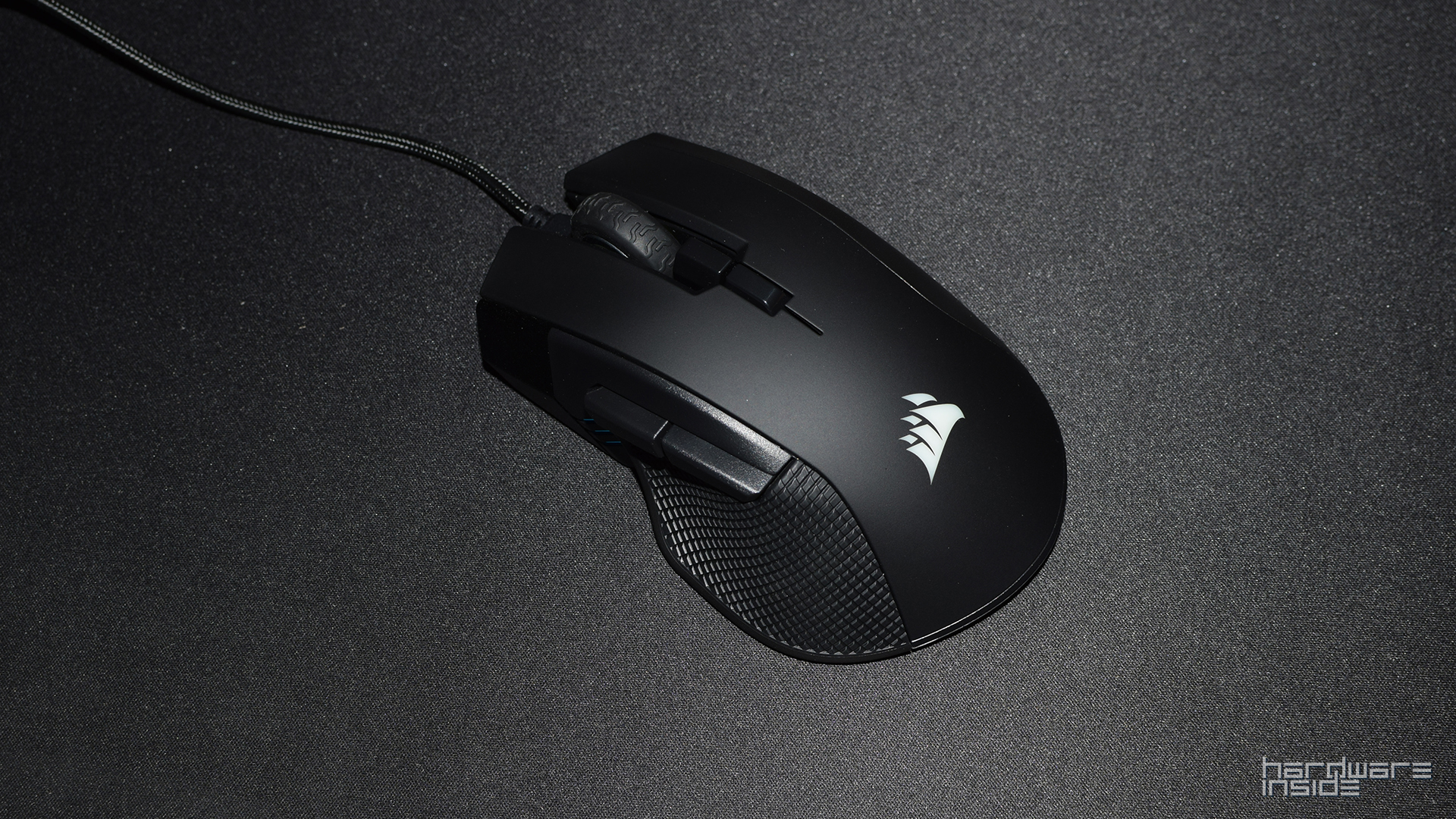 Im hinteren Bereich der Handauflagefläche ist das beleuchtete Corsair Logo aufgebracht. Darüber liegt, wie auf dem gesamten Mittelstück, eine Gummierung. Links und Rechts von der Maus ist ein Gummi angebracht, welches eine griffige Struktur aufweist. Zwischen diesem Gummi und dem Mittelstück befindet sich harter Kunststoff mit einer leicht rauen Oberfläche. Auch das Mausrad ist komplett aus Gummi mit einer reifenartigen Prägung. Das Mausrad lässt sich aber nicht zur Seite drücken. Damit fehlt zum Beispiel das seitliche Scrollen.