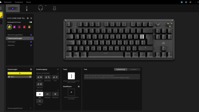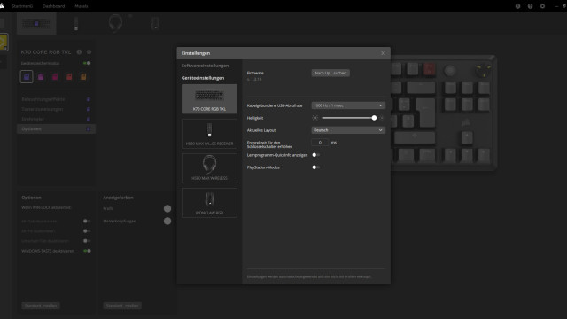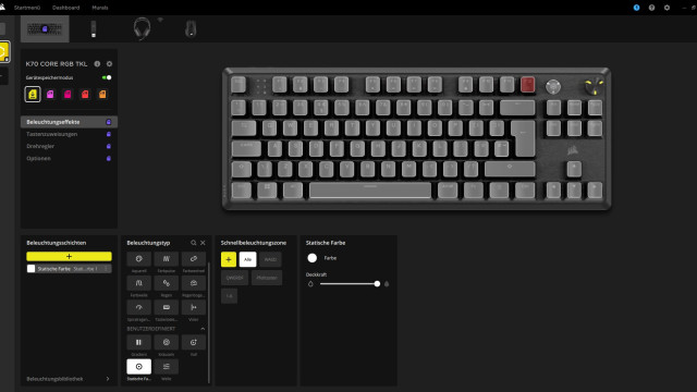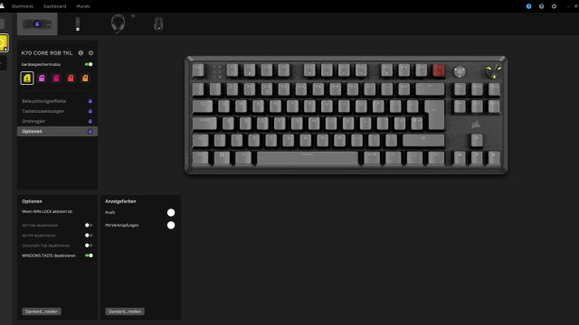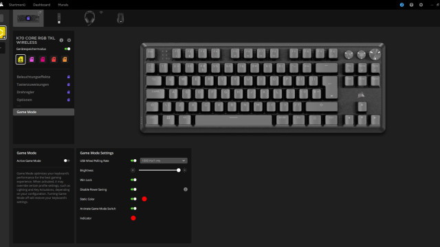 Haben wir die Software iCUE von Corsair geöffnet, finden wir nach dem Anschluss unserer Tastatur diese im Startmenü. Wählen wir diese aus, gelangen wir zur Personalisierung. Auf der linken Seite können wir uns entscheiden, ob wir die Einstellungen über die Software oder direkt im Gerät speichern wollen. In unseren Bildern entscheiden wir uns für die Speicherung im Gerät, da wir so nicht von der Software abhängig sind und die Tastatur auch an PCs anschließen können, die nicht über die Software verfügen. Dabei ist zu beachten, dass die Auswahl an Beleuchtungseffekten stark eingeschränkt ist. Trotzdem haben wir auch so alles, was das Herz begehrt. Bei der Tastenbelegung können wir einzelnen Tasten spezielle Funktionen zuweisen oder sie ganz deaktivieren. So können wir die Tasten neu belegen, Makros aufzeichnen oder sogar einen Text per Tastendruck schreiben lassen. Der Drehregler lässt sich nicht so stark personalisieren, hier müssen wir mit dem leben, was Corsair vorgegeben hat. Wir können aber die Optionen abschalten, die wir mit dem Drehknopf nicht nutzen wollen, wie z. B. das horizontale Scrollen. Mit der Tastenkombination FN + F12 können wir zwischen den Optionen wechseln, wobei die F12-Taste in der Farbe leuchtet, die für die Option hinterlegt wurde, z. B. weiß, wenn wir die Lautstärke regeln können. Unter den allgemeinen Optionen können wir auch einzelne Tastenkombinationen aktivieren oder deaktivieren. Im Einstellungsfenster kann die Abtastrate geändert werden. Hier wird auch die Firmware aktualisiert. Die Corsair K70 Core TKL Wireless verfügt zudem über den Reiter „Game Mode“, der die einzelnen dort aufgelisteten Funktionen aktiviert bzw. deaktiviert, sobald der „Game Mode“-Button gedrückt wird.