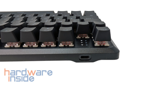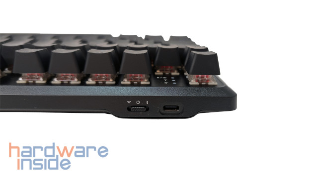 Auf der Oberseite befindet sich links oben der USB-Typ-C-Anschluss, über den die Tastatur mit Strom versorgt und aufgeladen wird. Darüber befinden sich auch die Status-LEDs für z. B. die Feststelltaste. Die kabellose Version besitzt zudem neben dem Port einen kleinen Switch, um die Konnektivität der Tastatur umzuschalten. So haben wir hier die Möglichkeit, zwischen Bluetooth, Kabel und 2,4 GHz zu wählen. In der Mitte der Oberseite befindet sich bei der Wireless-Version zusätzlich ein kleines Fach für den 2,4-GHz-Dongle, falls dieser nicht benötigt wird.