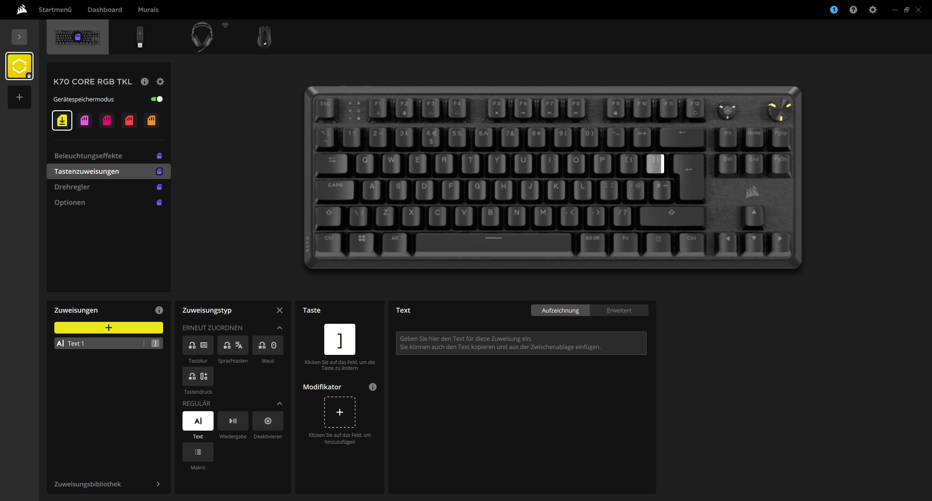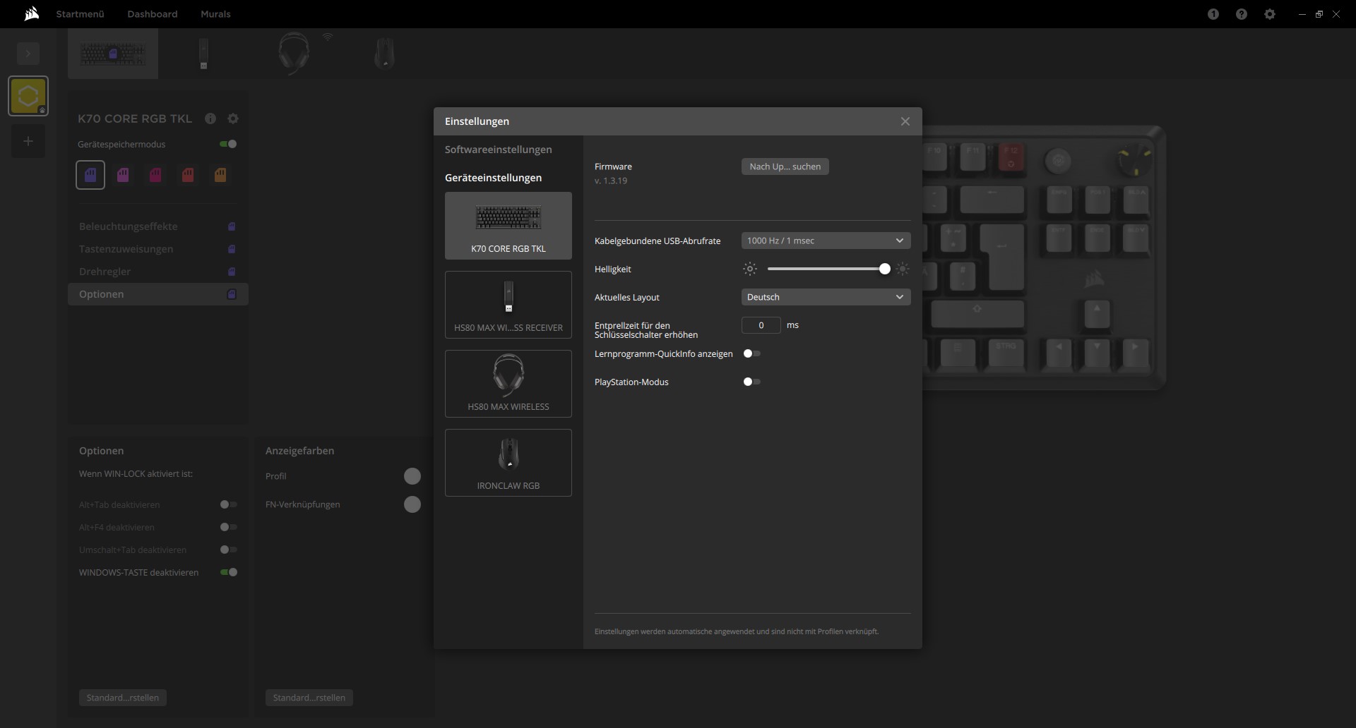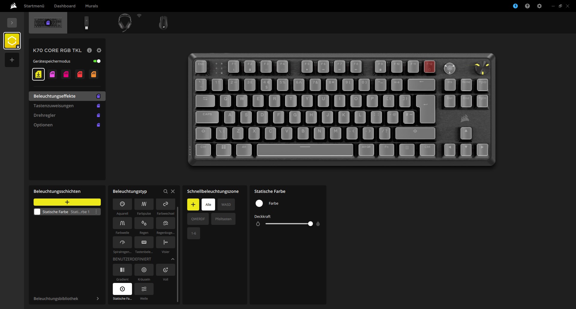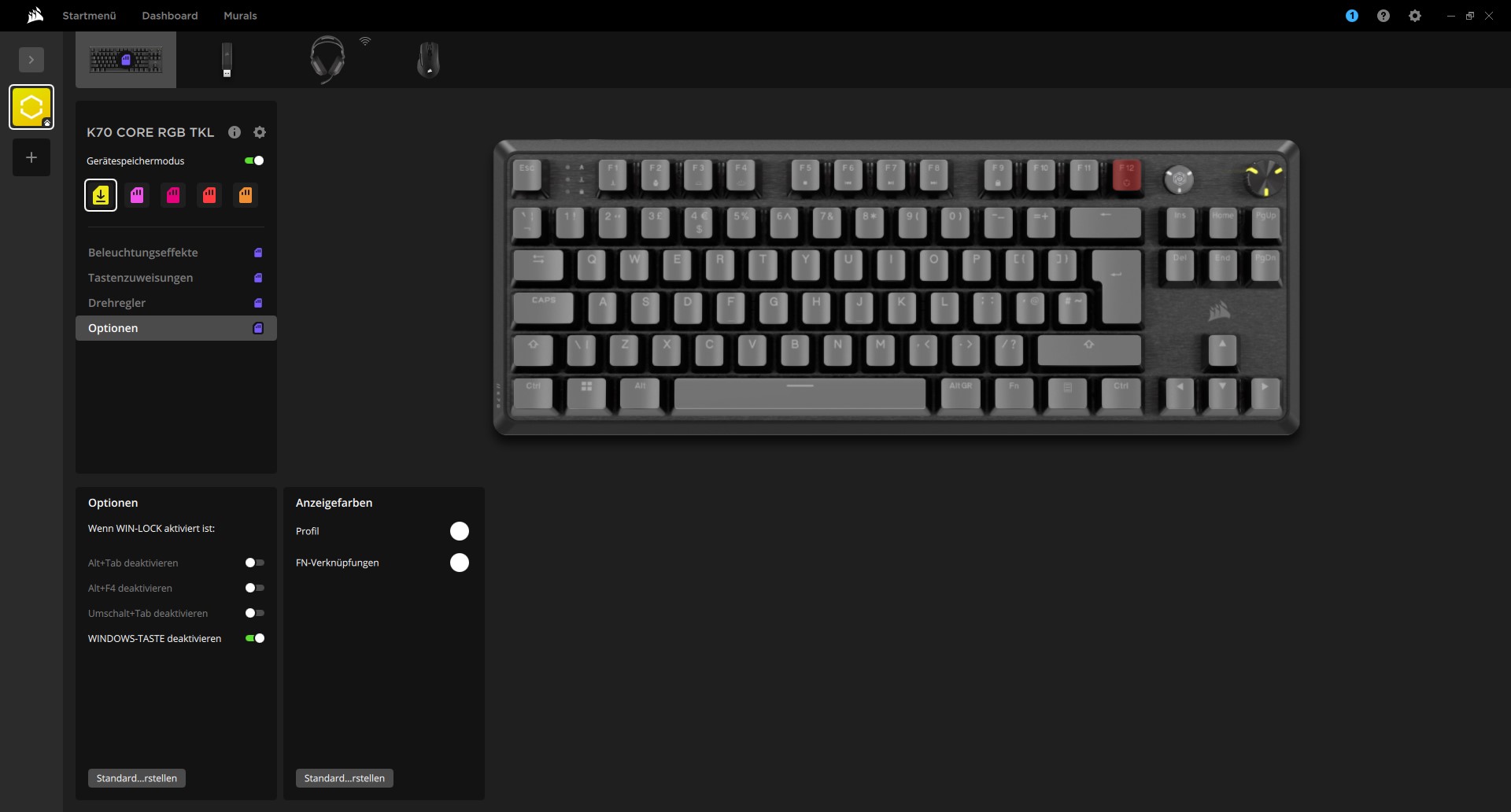 Haben wir die Software iCUE von Corsair geöffnet, finden wir nach dem Anschluss unserer Tastatur diese im Startmenü. Wählen wir diese aus, gelangen wir zur Personalisierung. Auf der linken Seite können wir uns entscheiden, ob wir die Einstellungen über die Software oder direkt im Gerät speichern wollen. In unseren Bildern entscheiden wir uns für die Speicherung im Gerät, da wir so nicht von der Software abhängig sind und die Tastatur auch an PCs anschließen können, die nicht über die Software verfügen. Dabei ist zu beachten, dass die Auswahl an Beleuchtungseffekten stark eingeschränkt ist. Trotzdem haben wir auch so alles, was das Herz begehrt. Bei der Tastenbelegung können wir einzelnen Tasten spezielle Funktionen zuweisen oder sie ganz deaktivieren. So können wir die Tasten neu belegen, Makros aufzeichnen oder sogar einen Text per Tastendruck schreiben lassen. Der Drehregler lässt sich nicht so stark personalisieren, hier müssen wir mit dem leben, was Corsair vorgegeben hat. Wir können aber die Optionen abschalten, die wir mit dem Drehknopf nicht nutzen wollen, wie z. B. das horizontale Scrollen. Mit der Tastenkombination FN + F12 können wir zwischen den Optionen wechseln, wobei die F12-Taste in der Farbe leuchtet, die für die Option hinterlegt wurde, z. B. weiß, wenn wir die Lautstärke regeln können. Unter den allgemeinen Optionen können wir auch einzelne Tastenkombinationen aktivieren oder deaktivieren. Im Einstellungsfenster kann die Abtastrate geändert werden. Hier wird auch die Firmware aktualisiert. Die Corsair K70 Core TKL Wireless verfügt zudem über den Reiter „Game Mode“, der die einzelnen dort aufgelisteten Funktionen aktiviert bzw. deaktiviert, sobald der „Game Mode“-Button gedrückt wird.