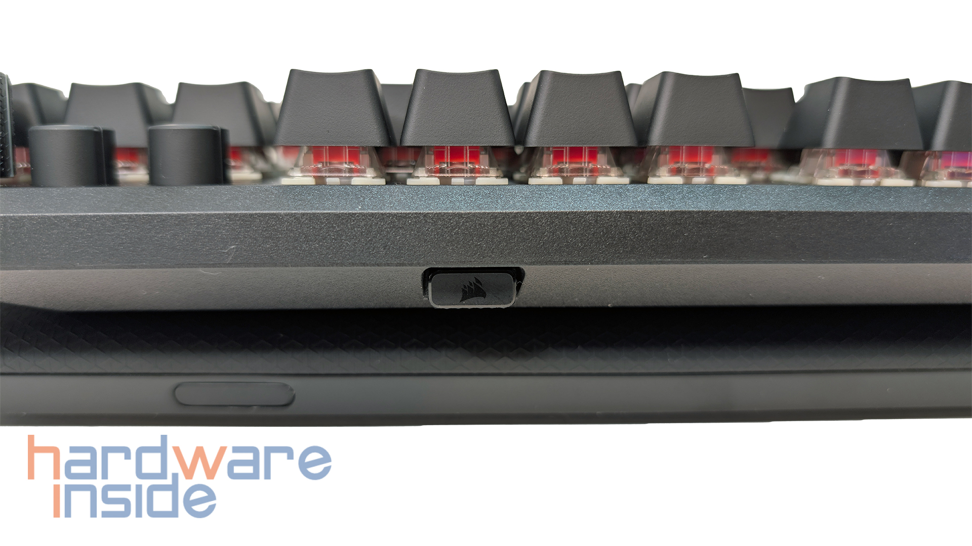 Rechts oben befindet sich ein Drehknopf, der auch gedrückt werden kann. Dieser ist bei der kabelgebundenen Version mit drei gelben Streifen versehen, bei der kabellosen Version mit grauen Streifen. Beide Tastaturen besitzen eine anpassbare Taste, die mit dem iCUE-Logo versehen ist und mit der iCUE-Software angepasst werden kann. Die kabellose Version besitzt zusätzlich die Taste „Game Mode“, welche die USB-Pollingrate auf 1.000 Hz setzt, Winlock aktiviert, die statische Beleuchtung aktiviert sowie FlashTap aktiviert. FlashTap ist ein Modus für bestimmte Tasten, der entweder der ersten oder der letzten gedrückten Taste Priorität einräumt, was z. B. bei FPS-Shootern ein besseres Strafing ermöglicht. Aber auch die Wired-Variante kann dies, hat aber keine dedizierte Taste dafür.