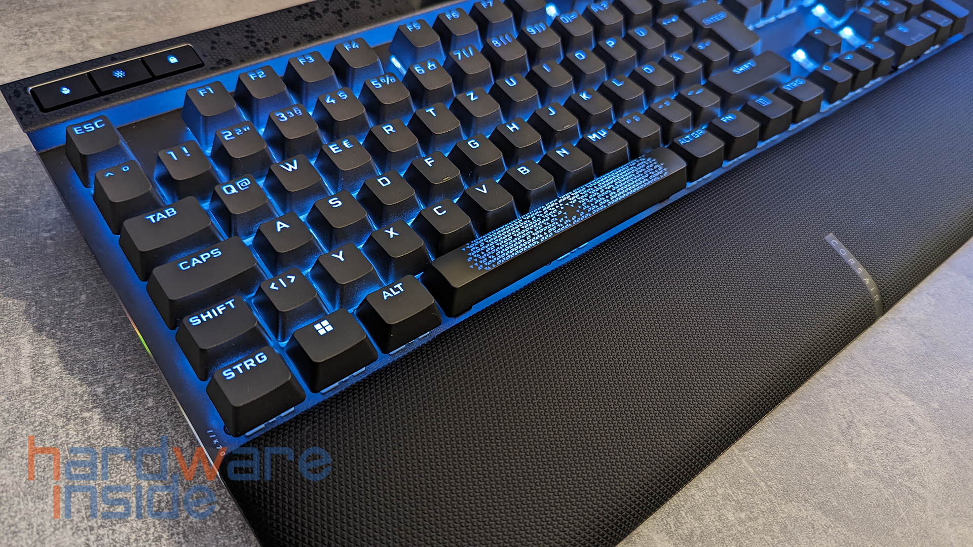 Die Ausleuchtung der Corsair K70 MAX ist sehr gleichmäßig und hinterlässt einen sehr guten Eindruck. Lediglich das „E“ der Eingabetaste ist nicht vollständig ausgeleuchtet, da der Schriftzug vermutlich zu lang für eine einzelne LED ist. Die Tasten auf dem Numpad, die eine Zweitfunktion haben, beleuchten die Zweitfunktion etwas schwächer, um einen Kontrast zu erzeugen. Die mitgelieferte Tastenkappe für die Leertaste macht sich ebenfalls sehr gut. Die Leertaste selbst verfügt über drei einzelne LEDs, so dass sie gleichzeitig in mehreren Farben leuchten kann.