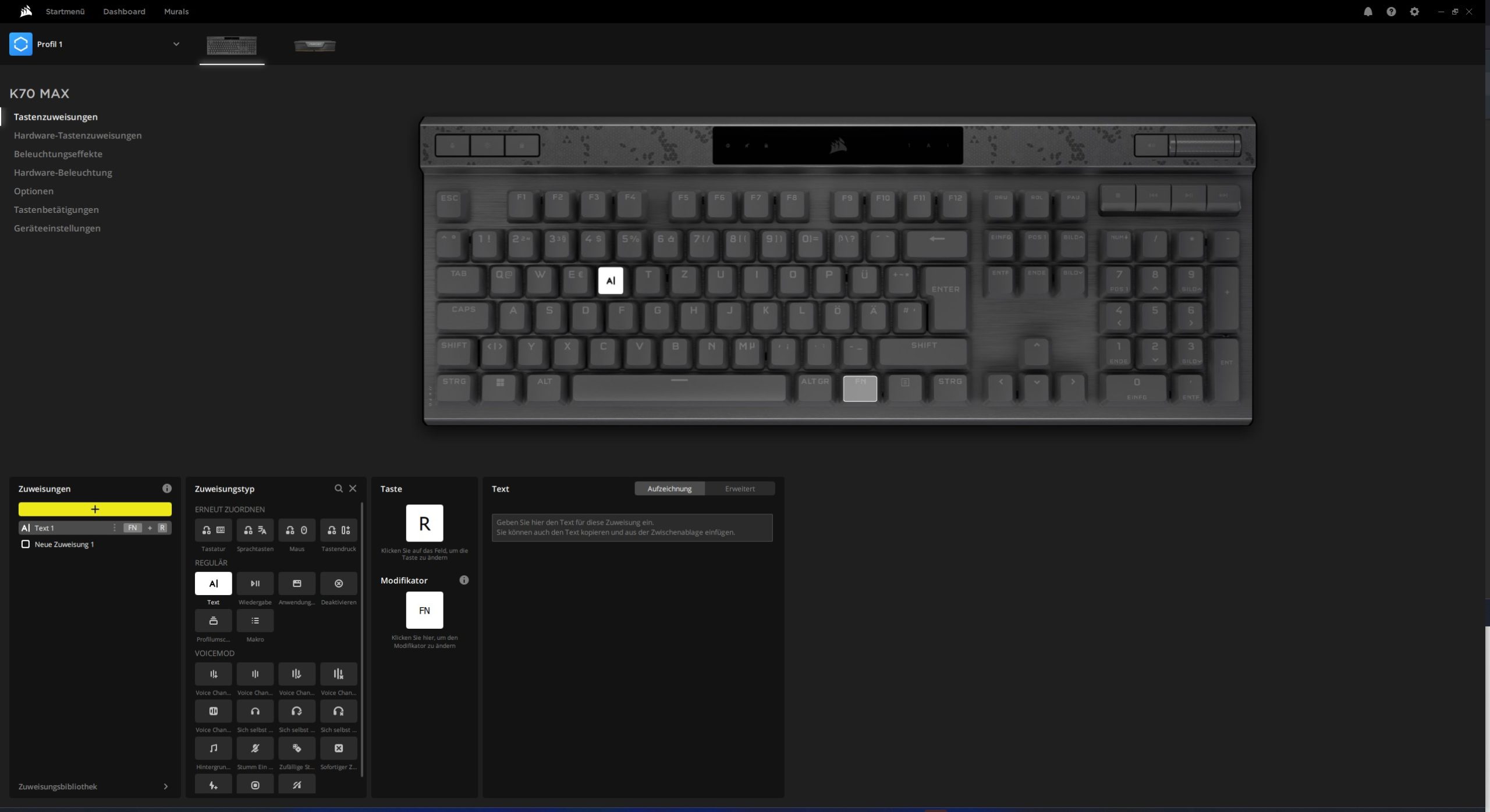 Beginnen wir mit dem Reiter Tastenzuweisung. Hier kann man zwischen verschiedenen Belegungstypen wie Text, Makro oder Voicemod, sofern man eine Lizenz besitzt, wählen und diese auf eine Taste legen. Dabei können wir auch einen Modifikator auswählen, im Falle der Corsair K70 MAX ist dies die Fn-Taste. Wenn wir zwei Triggerpunkte auf den Switches aktiviert haben, können wir hier auch eine zweite Funktion auf die gleiche Taste legen, je nachdem wie tief wir den jeweiligen Schalter drücken.