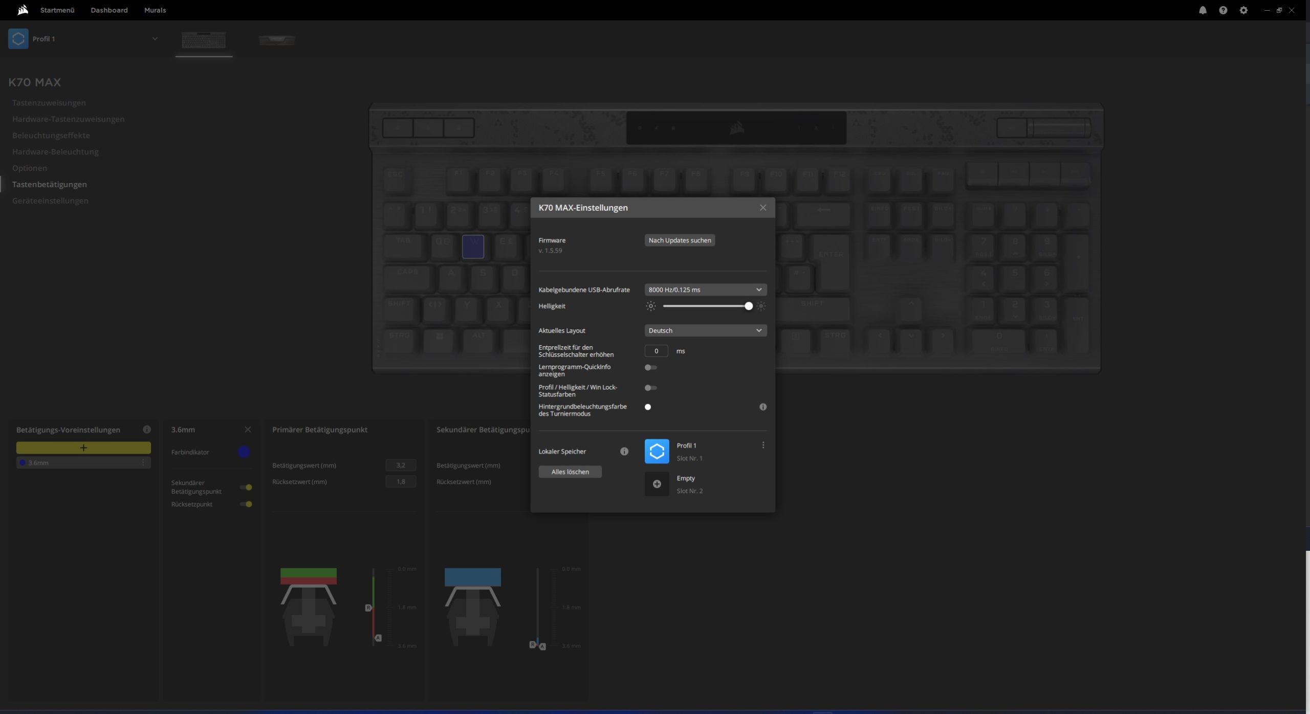 Unter Optionen können wir einstellen, was bei Aktivierung der WIN-LOCK-Taste alles deaktiviert wird. Hier können wir auch individuelle Farben für die drei Funktionstasten oben links auf der Tastatur einstellen, falls wir sie nicht schon mit einem anderen Effekt überschrieben haben. Über den Reiter Tastenbetätigungen legen wir unsere Bestätigungspunkte sowie den Rücksetzpunkt fest. Es ist nicht notwendig, einen sekundären Auslösepunkt und einen Rücksetzpunkt zu definieren. Unter Geräteeinstellungen aktualisieren wir die Firmware der Tastatur, stellen die Abtastrate ein, können die Helligkeit der Tastatur einstellen, die Farbe des Turniermodus ändern sowie unsere Profile in den lokalen Speicher der Corsair K70 MAX übertragen. Die Software ist sehr übersichtlich aufgebaut und bietet an vielen Stellen kleine Infomarker, die verschiedene Funktionen erklären.
