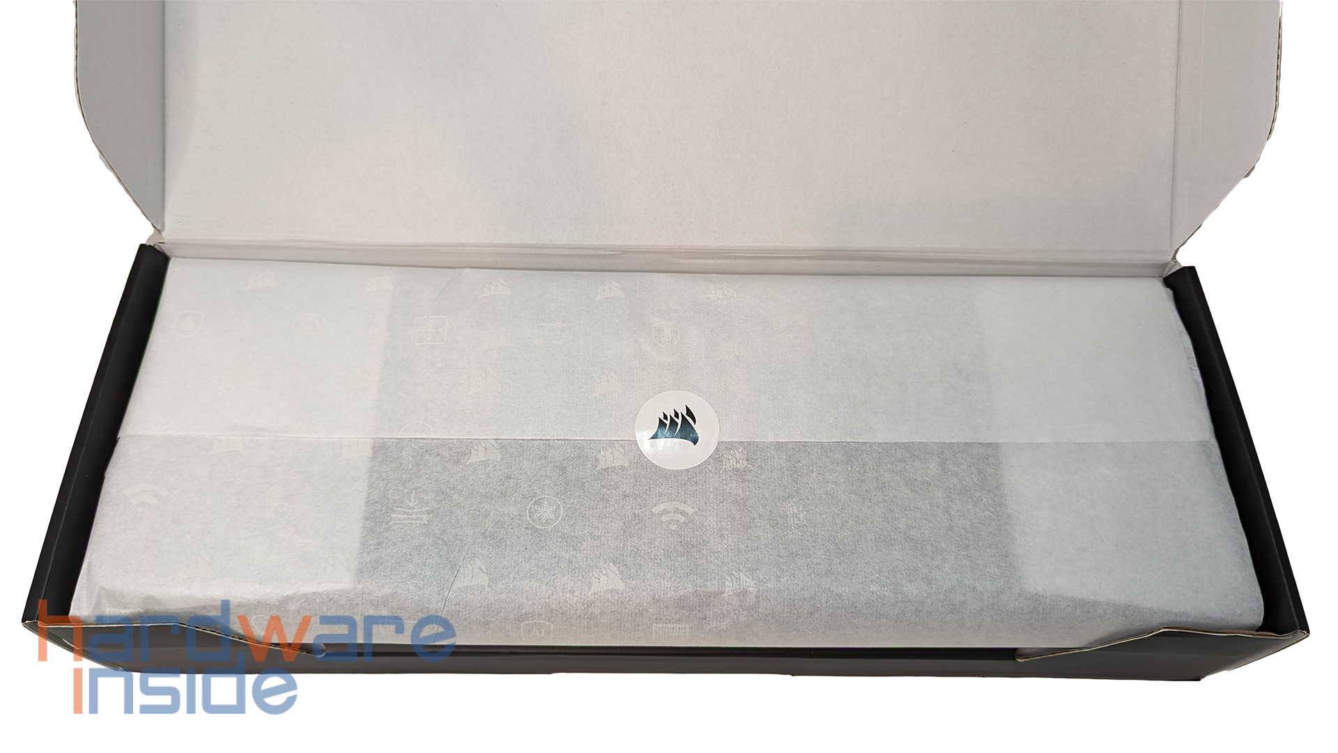 Im Inneren des Kartons verbirgt sich die Corsair K70 MAX sicher in Papier verpackt. Darunter ist ein QR-Code für die Bedienungsanleitung aufgedruckt. Zieht man an einer kleinen Lasche, kommt die ebenfalls in Papier eingewickelte Handballenauflage zum Vorschein. Außerdem liegt noch folgendes Zubehör bei: