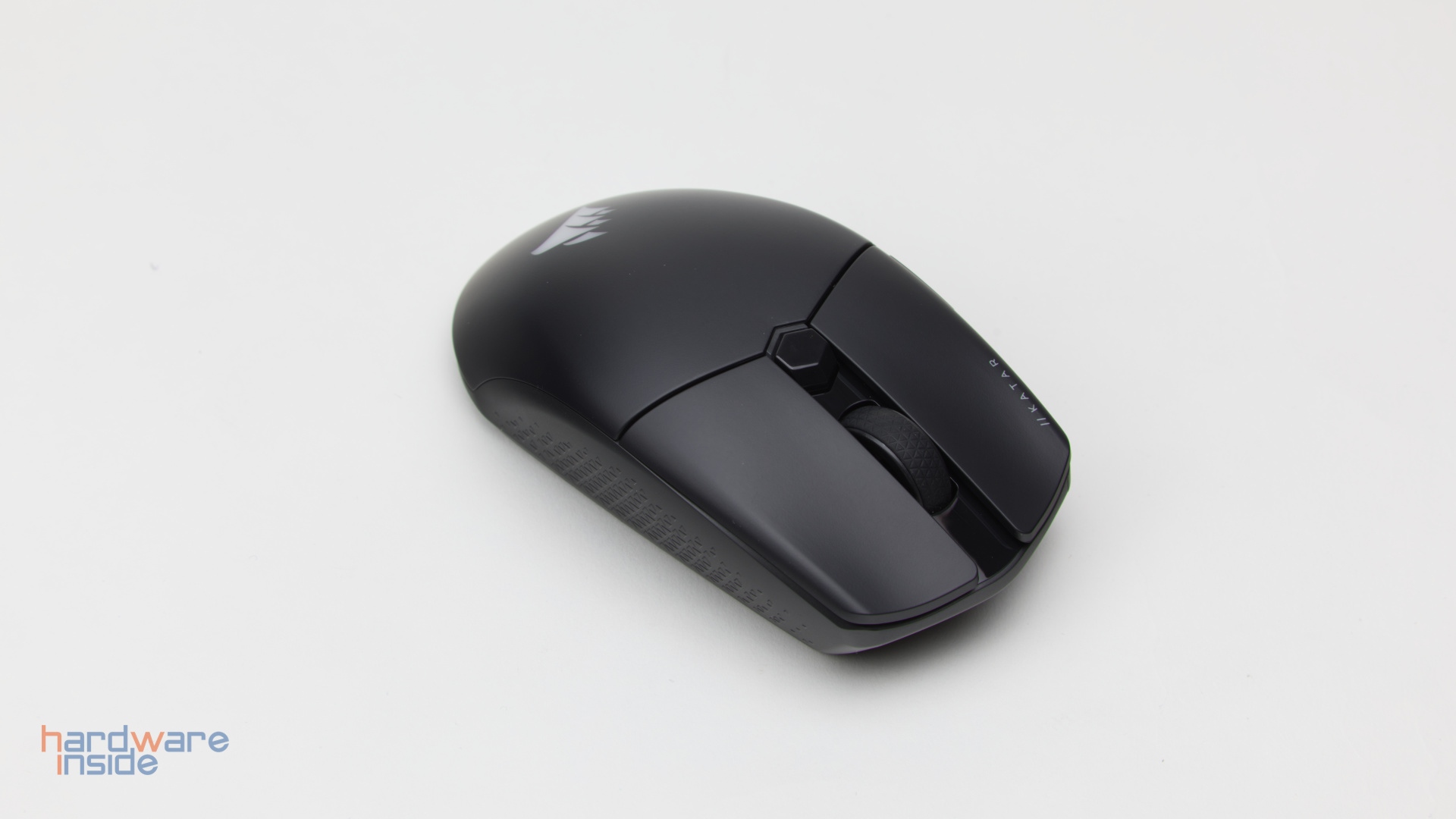 Die Corsair Katar Elite Wireless ist sehr schlicht gehalten und wird ausschließlich in schwarzer Version verkauft. Sie setzt auf ein symmetrisches Design, bietet sich gleichzeitig aber nur für Rechtshänder an – die Daumentasten sind nur auf der linken Seite zu finden. Mit ihren 115,8 x 64,2 x 37,8 mm ist die Maus klein und mit nur 69 Gramm gehört sie zu den sehr leichten Vertretern der Gamingmäuse. Bedingt durch diese Eigenschaften und die angepasste Oberfläche lässt sie sich sehr gut greifen. Als Material kommt angerauter Kunststoff zum Einsatz, während die Seiten durch ein Dreiecksmuster griffiger gemacht wurden. Insgesamt gibt es an der Verarbeitung nichts auszusetzen, haptisch hinterlässt sie also einen guten Eindruck. Auch bei Einsatz höheren Drucks gibt die Maus nicht nach, knarzen sucht man vergebens.