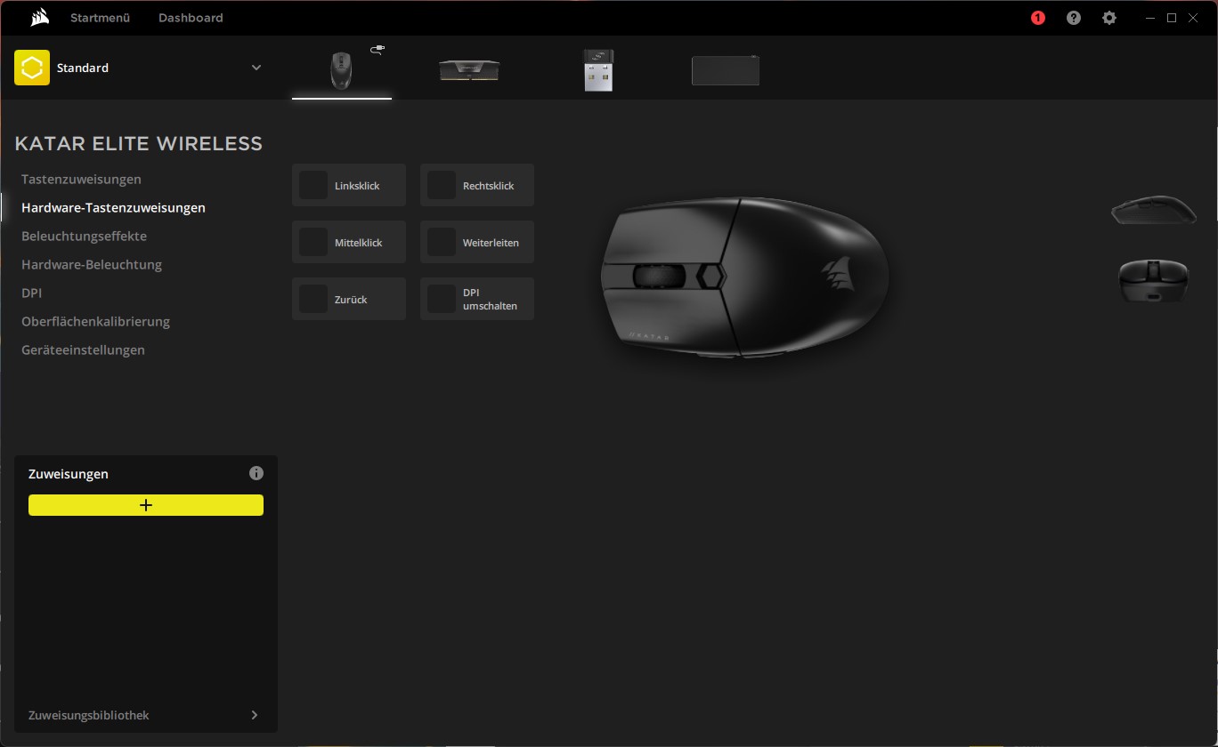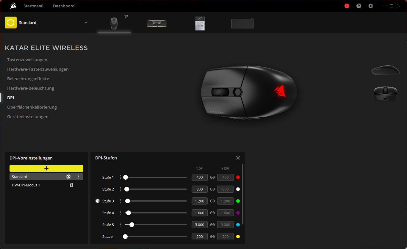 Die Leistung des Sensors lässt sich anpassen, neben der Lift-off-Distance und der Pollingrate kann so auch die dpi eingestellt werden. Über den dpi-Schalter stehen 5 Profile zur Auswahl, zwischen welchen on-the-fly durchgewechselt werden kann. Firmware-Updates erfolgen ebenfalls über iCUE, was bei uns problemlos funktioniert hat. Das erste große iCUE-Update selbst war aber erst nach dem 2. Versuch erfolgreich, da die Software zwischendrin abgestürzt ist. Mit über 1,1 GB ist iCUE unerwartet groß, hier kann die Software heruntergeladen werden.