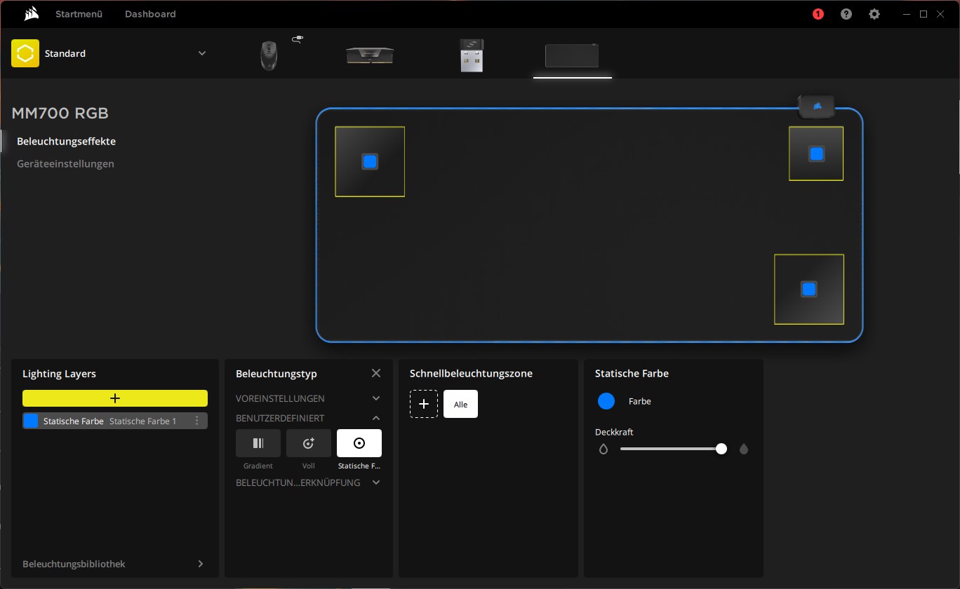 Das Corsair MM700 XXL Mousepad setzt auf eine Oberfläche aus Mikrofaser, was gute Gleiteigenschaften und leisen Betrieb zur Folge hat. Der USB-Hub auf der oberen rechten Seite ist praktisch und kann vielseitig eingesetzt werden, ist aber auf USB 2.0 begrenzt. Das schließt einige Anwendungsfälle wie den Einsatz einer externen Festplatte quasi aus. Die Beleuchtung über den am Rand eingelassenen Streifen ist ansehnlich und gefällt durch eine hohe Helligkeit und die vielen vordefinierten Szenarien. Die Ausleuchtung ist nicht ganz perfekt, was den Eindruck am Schreibtisch aber kaum schmälert. Sollte die Größe von 1.220 mm x 610 mm zu viel des Guten sein, kann auch auf kleinere Varianten zurückgegriffen werden. Wie bereits erwähnt, lassen sich die Beleuchtungsprofile kompatibler Geräte in iCUE synchronisieren.