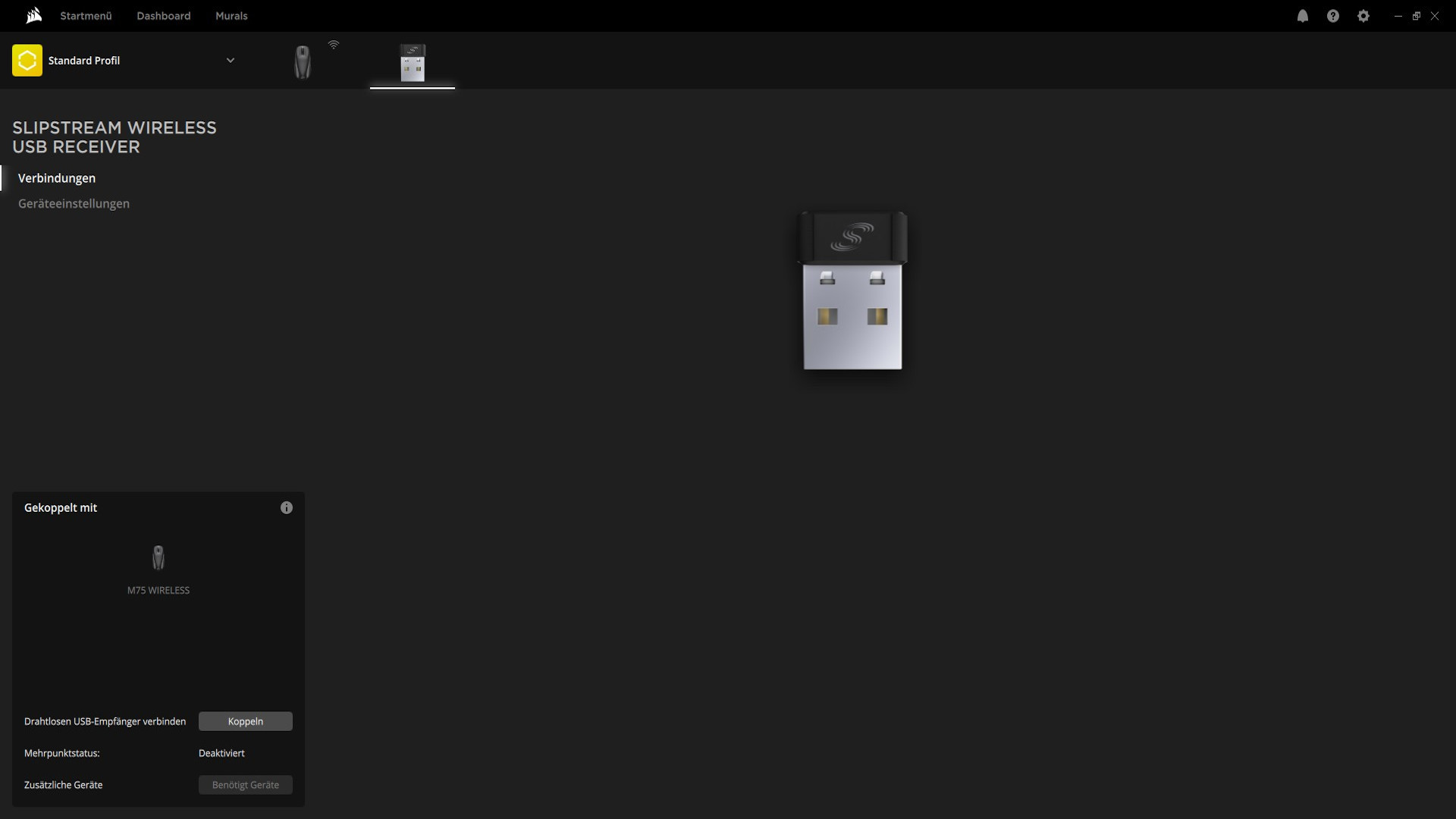 Bei der CORSAIR M75 WIRELESS kommt die kabellose SLIPSTREAM-Technologie mit bis zu 1000 Hz Hyper-Polling zum Einsatz. Diese ermöglicht extrem kurze Reaktionszeiten in der Funkverbindung. Die Abtastrate sowie die damit verbundene Reaktionszeit kann der Nutzer selbst in der iCUE-Software, unter den Einstellungen des USB-Funkempfängers festlegen.