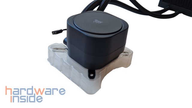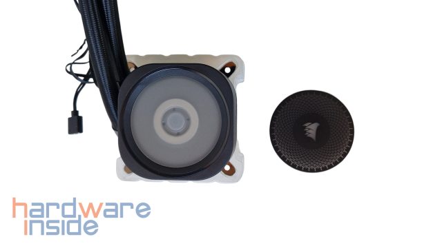 Das Pumpengehäuse selbst ist aus schwarzem Kunststoff gefertigt. Auf der Oberseite befindet sich eine Runde Abdeckung, die mit einem dreidimensionalen Muster und dem mittig angebrachten Corsair-Logo versehen und zugleich abnehmbar ist. Sie wird unterhalb von einem Magneten gehalten und lässt sich in 90° Schritten drehen, das könnte den Einbau im Nachhinein vereinfachen. Seitlich gehen sowohl das Kabel für die Steuerung der Pumpe sowie ein 3-Pin ARGB Kabel ab. Im Inneren kommt eine 3-Phasen-Pumpe zum Einsatz, die zwei wesentliche Vorteile mit sich bringt; zum einen eine höhere Durchflussrate bei flüsterleisen 20 dB(A) und zum anderen die Effizienz, welche wir später im Test noch erfahren werden.
