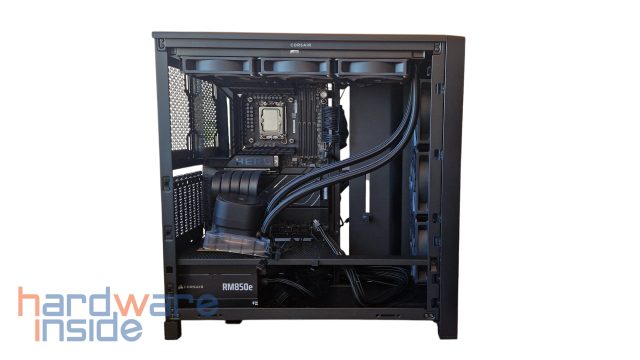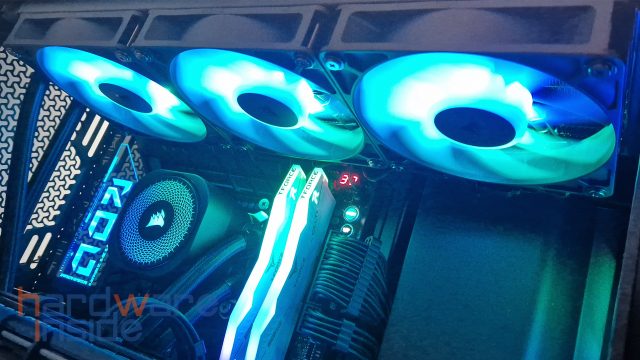 Der Einbau ist nahezu selbsterklärend. Die Backplate kann, muss aber nicht mithilfe des kleinen 3M-Klebepads, an die Rückseite des Mainboards angebracht werden. Die Abstandshalter in unserem Fall Sockel 1851 werden verschraubt und das passendes Sockel-Material für AMD liegt ebenfalls dem Lieferumfang bei. Auf dem Radiator wurden die drei 120RS Lüfter montiert, der seinen Platz oberhalb des Gehäuses finden wird. Da bereits ab Werk eine Wärmeleitpaste aufgetragen ist, entfällt das händische Auftragen und so kann der CPU-Kühler mittels der vier im Lieferumfang enthaltenden Rändelschrauben verschraubt werden. Alle benötigten Kabel werden angeschlossen, noch einmal gegen kontrolliert und es kann losgehen.