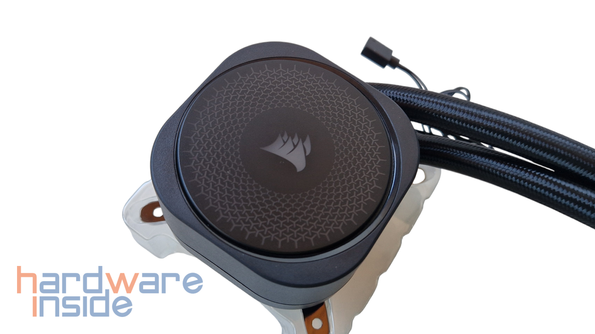 Das Pumpengehäuse selbst ist aus schwarzem Kunststoff gefertigt. Auf der Oberseite befindet sich eine Runde Abdeckung, die mit einem dreidimensionalen Muster und dem mittig angebrachten Corsair-Logo versehen und zugleich abnehmbar ist. Sie wird unterhalb von einem Magneten gehalten und lässt sich in 90° Schritten drehen, das könnte den Einbau im Nachhinein vereinfachen. Seitlich gehen sowohl das Kabel für die Steuerung der Pumpe sowie ein 3-Pin ARGB Kabel ab. Im Inneren kommt eine 3-Phasen-Pumpe zum Einsatz, die zwei wesentliche Vorteile mit sich bringt; zum einen eine höhere Durchflussrate bei flüsterleisen 20 dB(A) und zum anderen die Effizienz, welche wir später im Test noch erfahren werden.