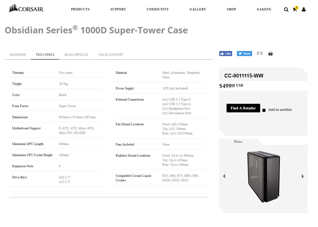 Das zukünftige Flaggschiff-Gehäuse, das Obsidian 1000D Super-Tower (Modell: CC-9011115-WW), ist dank eines begehrten Amazon-Angebotes ins Internet geraten und besitzt dort einen Preis von 500 USD. Das Obsidian 1000D behält den „nur für Erwachsene“ -Stil der Serie bei, mit einer schönen Kombination aus gebogenem gehärtetem Glas, mattschwarzem Aluminium und einer subtilen Menge an RGB-LED-Beleuchtungselementen. Das Feature-Set wird jedem anderen High-End-Tower die Stirn bieten können.