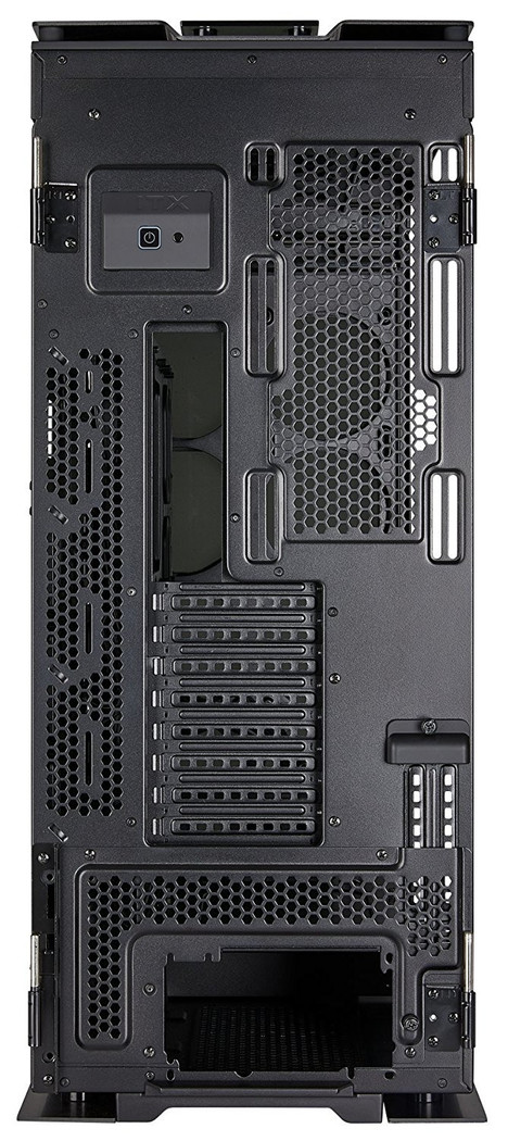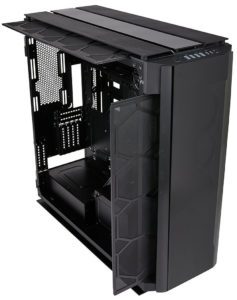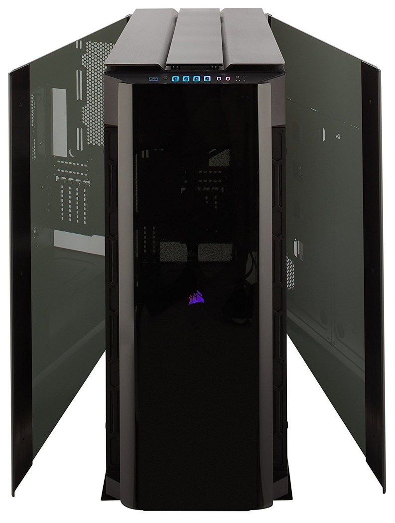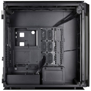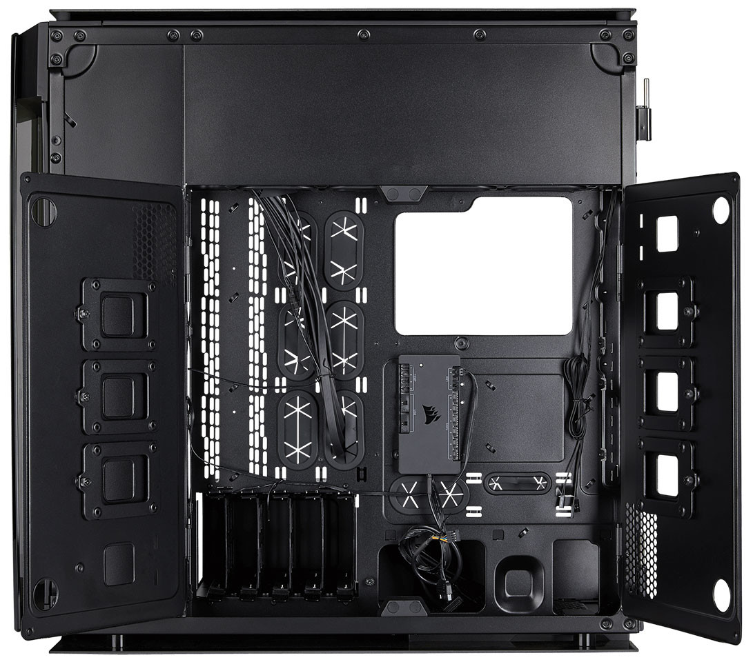 Dieses Gehäuse ist so groß, dass es bis zu acht 120-mm-Lüfter entlang der Frontplatte (vier auf jeder Seite eines Innengrills) aufnehmen kann Dazu passen drei 140-mm am oberen Luftauslass und zwei 120-mm am rückseitigen Luftauslass. Die Radiatorenhalterung wird somit 480 mm × 120 mm vorne, 420 mm × 140 mm oben und 240 mm × 120 mm hinten sein. Laufwerkhalterungen umfassen sechs 2,5-Zoll- und drei 3,5-Zoll-Laufwerke. Ein Corsair Commander Pro Lüfter- und Beleuchtungscontroller ist ebenso integriert.