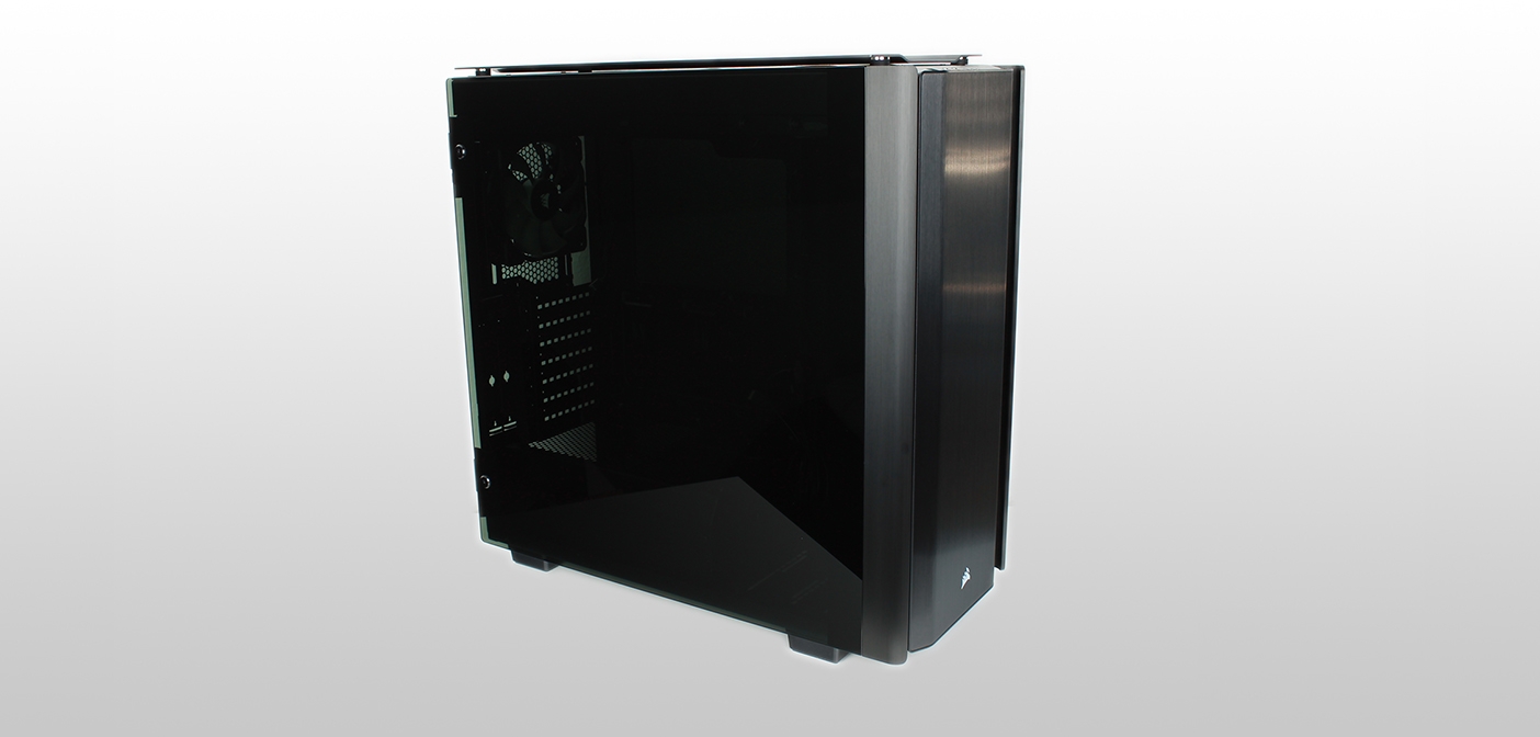 Die Front des Gehäuses besteht aus Aluminium mit gebürsteter Optik. Im unteren Bereich befindet sich ein silbernes Corsair Logo. Die Sidepanels überlappen die Front links und rechts leicht, die Lücke dazwischen dient als Lufteinlass.