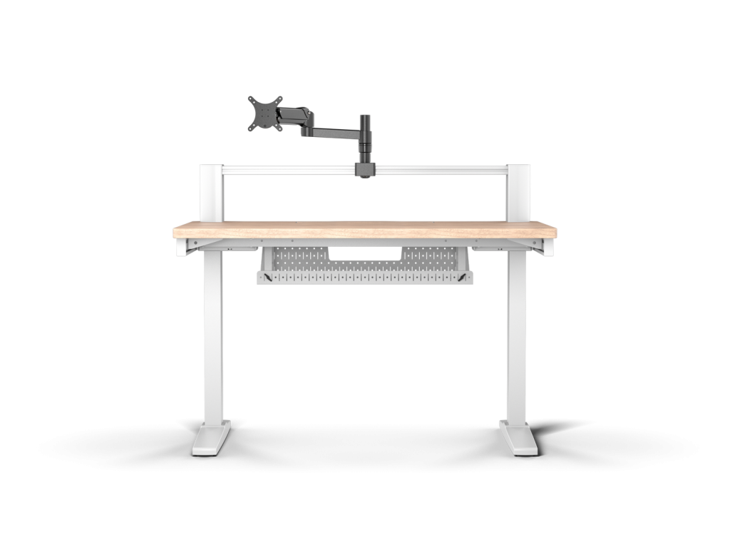 Der Platform:4 behält das Upgrade-fähige Design des Platform:6 bei. Er verfügt über T-Schienen aus Aluminium unter und über dem Schreibtisch, die für die Montage von Zubehör und Peripheriegeräten sowie für Erweiterungen vorgesehen sind. Der Platform:4 verfügt über einen einzelnen Monitorarm mit einer VESA-100-Halterung, die auch größere Ultrawide-Monitore mit einem Gewicht von bis zu 12 kg tragen kann. Der Monitorarm wird am Hauptschienensystem des Tisches befestigt und ermöglicht die Anbringung weiterer Monitorarme und zahlreicher kompatibler Zubehörteile wie Mikrofon- und Webcam-Halterungen. Außerdem verfügt er über eine USB-Stromversorgung im Schreibtisch mit Type-A- und Type-C-Anschlüssen, um das Aufladen von Geräten zu vereinfachen. Kabel und Power Bricks können mit der CORSAIR RapidRoute-Kabelwanne einfach hinter dem Schreibtisch verstaut werden.