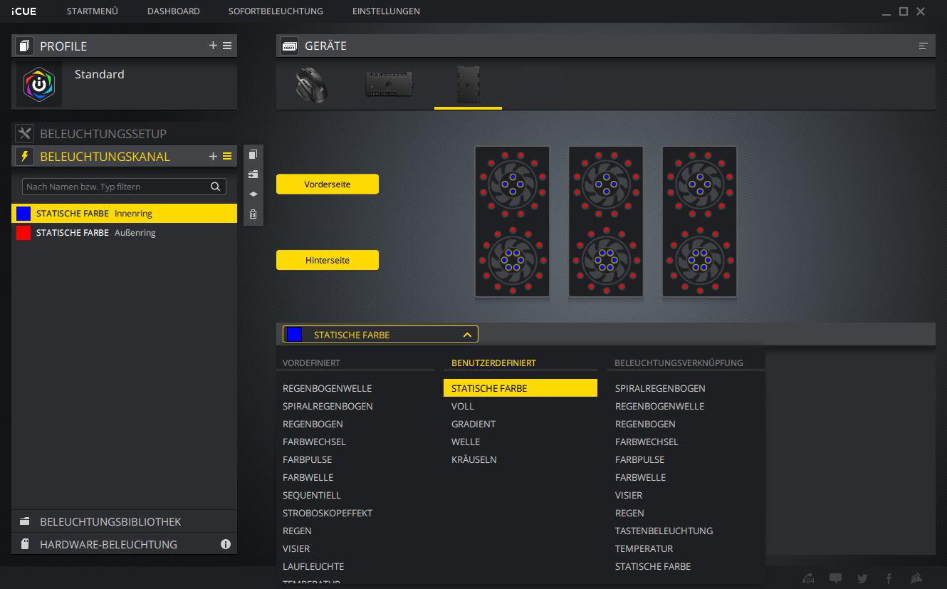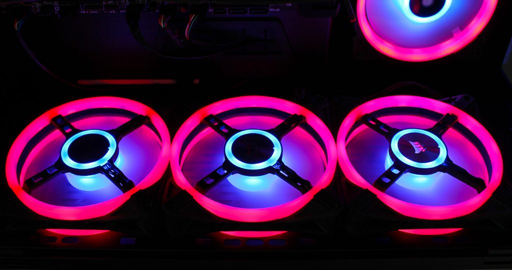 Über die Corsair iCUE Software können alle 34 RGB LEDs jedes Lüfters der QL-Serie einzeln angepasst werden. Zusätzlich können vorgegebene Farbprofile ausgewählt werden. Durch die zusätzlichen Loops auf der Rückseite ist das Anpassungspotenzial noch mal deutlich gestiegen. Die Farben sind kräftig und angenehm hell.