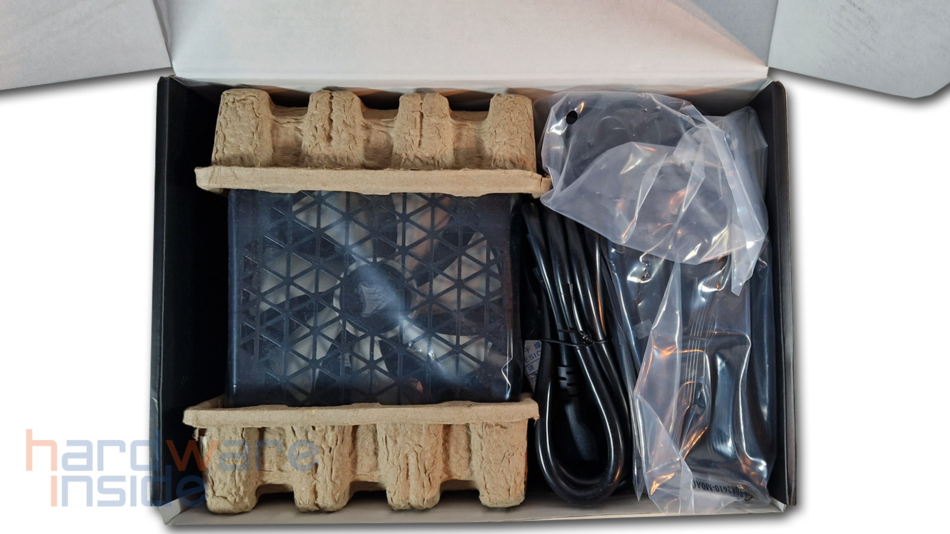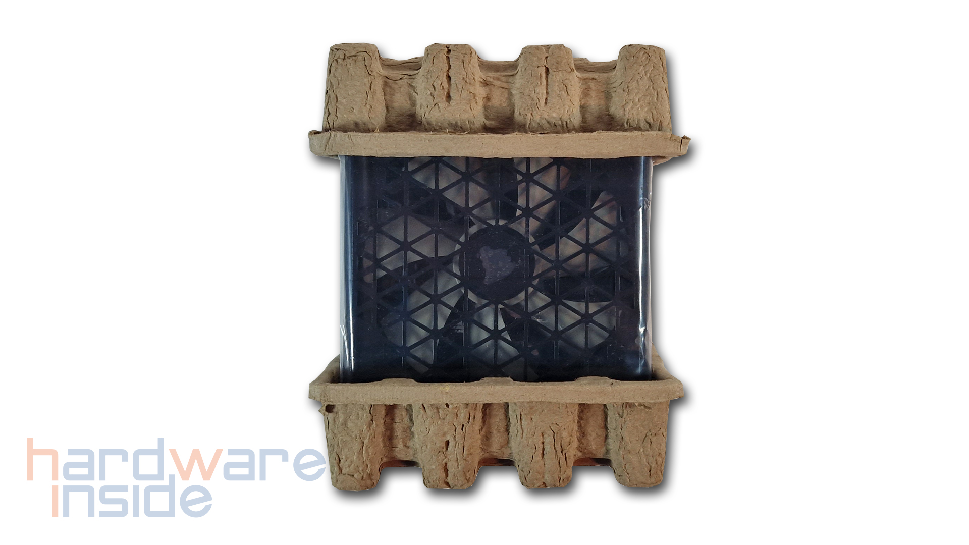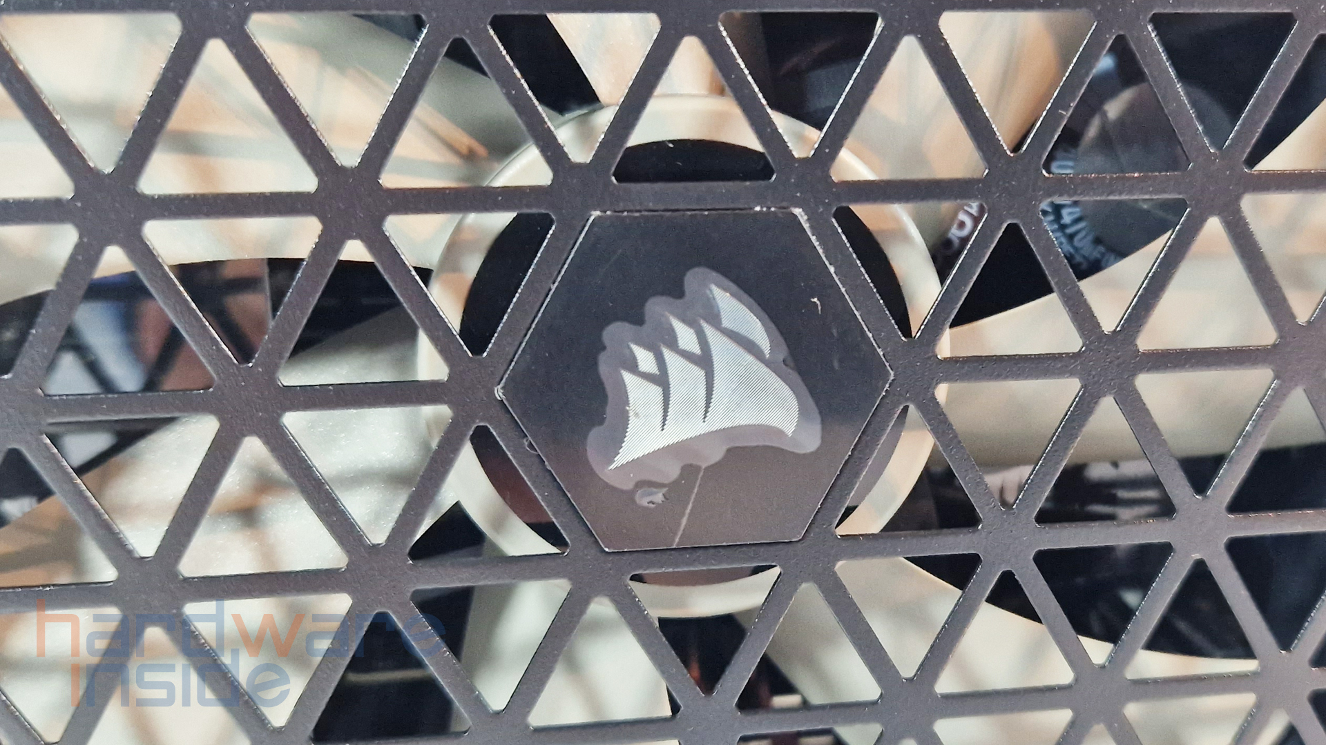 Auf der Unter- und der Rückseite findet man das für Corsair typische Lüftungsgitter im Dreiecksdesign und dem mittig angebrachten Corsair-Logo sowie den dahinter verbauten Lüfter.