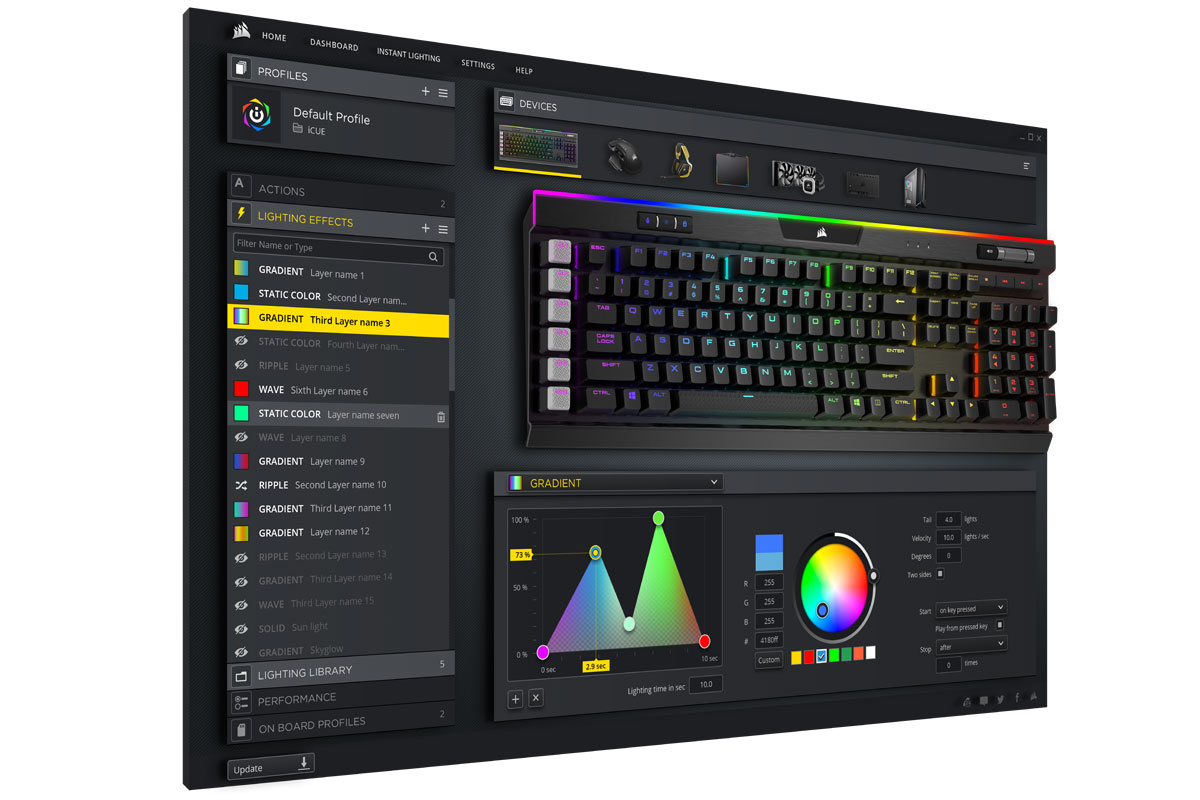 Erstmalig bei CORSAIR vereint iCUE die dynamische Lichteffektsteuerung, die Kühlungssteuerung, die Systemüberwachung sowie die Anpassung von Befehlen auf einer zentralen und intuitiven Oberfläche und ermöglicht damit die Unterstützung von praktisch tausenden von CORSAIR-Produkten. Diese reichen von Tastaturen und Mäusen wie der K70 RGB LUX und der M65 PRO RGB, zu den Hydro Series PRO-CPU-Flüssigkeitskühlern und den AXi Series-Netzgeräten – iCUE vereint Ihr gesamtes System mit synchronisierten Lichteffekten und einer leistungsstarken Systemsteuerung.
