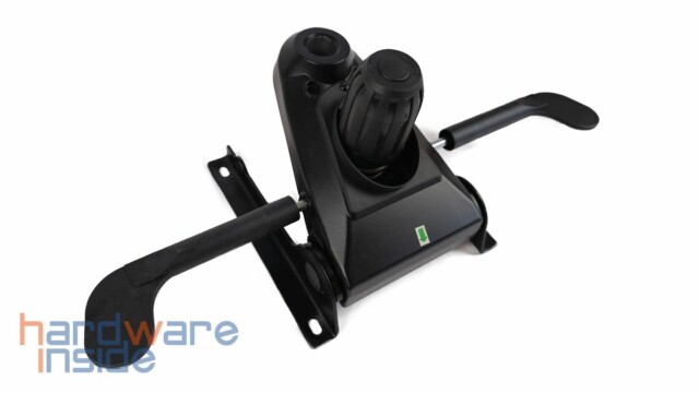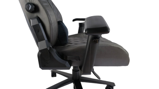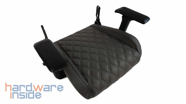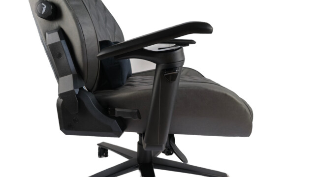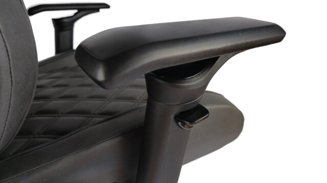 Weiter geht es mit den Omniflex Armlehnen, die wir nach vorne- und zurückschieben können. Diese können wir auch nach Innen bzw. nach Außen lenken und so eine geeignete und bequeme Sitzposition finden. Die nach unten geneigten Stellen der Armlehnen zeigen sich als gute Sitzposition für Controller-Gamer. Lediglich das Drehen bzw. Lenken der Omniflex Armlehnen empfinden wir als etwas zu leichtgängig. Die Armlehnen können auch zu den Seiten Innen bzw. nach Außen fixiert werden, jedoch leider nur durch die eigentliche Halterung mit den Schrauben an der Unterseite der Sitzfläche. Die Armlehnen selbst bewegen sich hierbei nicht seitlich.