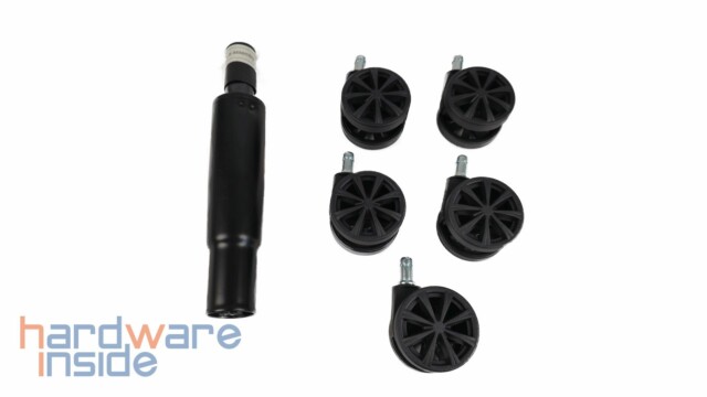 Der Aufbau ist intuitiv und es ist nicht unbedingt eine Anleitung vonnöten, wir gehen trotzdem einmal von Vorn bis Hinten durch. Zuerst nehmen wir das Fußkreuz in Sternform, das aus Aluminium in Schwarz gefertigt ist, zur Hand. An der Unterseite verbinden wir die fünf Räder aus Kunststoff, die werkzeuglos in das Fußkreuz gesteckt werden können. An diesem Punkt drehen wir das Fußkreuz um, was auf dem Untergrund selbst aber noch nicht fährt, da nicht ausreichend Gewicht und Kraft als Belastung vorhanden sind. Das sorgt für einen standfesten Halt bei der Nutzung des Corsair TC500 LUXE Gaming-Stuhls gegen ungewollte Bewegung.