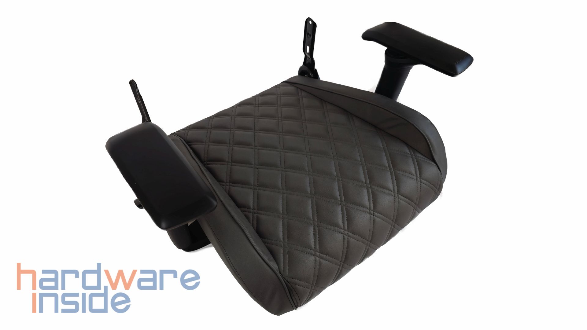 Nicht nur die Breite des Stuhls ist auffällig, sondern auch das aufgestickte Rauten-Muster, das Einsacken und Dehnen des Materials verhindert. Als Nebeneffekt entsteht hier auch eine hübsche Optik. Das Material ähnelt einem matten und reflektierenden Leder, bleibt aber durch den besonderen Stoffbezug atmungsaktiv. Unter niedrigeren Temperaturen wärmt sich der Stoff schnell auf und sorgt für eine gute Luftzirkulation auch bei längeren Sessions. Die Seitenpolsterung der Sitzfläche und der obere Teil der Rückenlehne sind nicht von dem Stickmuster betroffen und zeigen eine glatte Oberfläche mit Corsair Akzenten. Die gesamte Oberfläche, die nicht aus Metall besteht, ist leicht angeraut und überträgt ein angenehmes Gefühl auf der Haut. Die Verarbeitung des Materials erscheint stabil und langlebig. Bei verschiedenen Lichtverhältnissen, erscheint die Farbe auch etwas dunkler oder heller. Man könnte sogar die Veränderung der Farbe in verschiedenen Lichtverhältnissen erkennen.