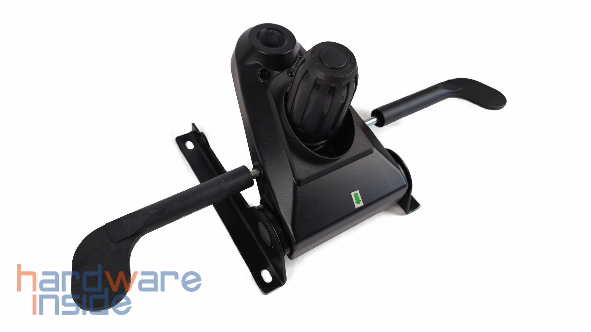 Das Fußkreuz und der Wippmechanismus samt der Gasdruckfeder sind sauber verarbeitet und lackiert. Im Inneren verbirgt sich eine Metallkonstruktion, die den Stuhl stabil und ebenfalls langlebig gestaltet. Mittig befindet sich ein weiterer Mechanismus, der an den eigenen Rücken angepasst werden kann – die Lordosenstütze. So kann mit den drehbaren Rädern an der rechten bzw. an der linken Seite der Rückenlehne die Form im unteren Bereich des Rückens verstellt werden. Hierbei kann das Gestell heraus- oder hereingefahren bzw. hinauf- oder hinabgefahren werden. Man merkt deutlich die verstellte Unterstützung im unteren Rücken.