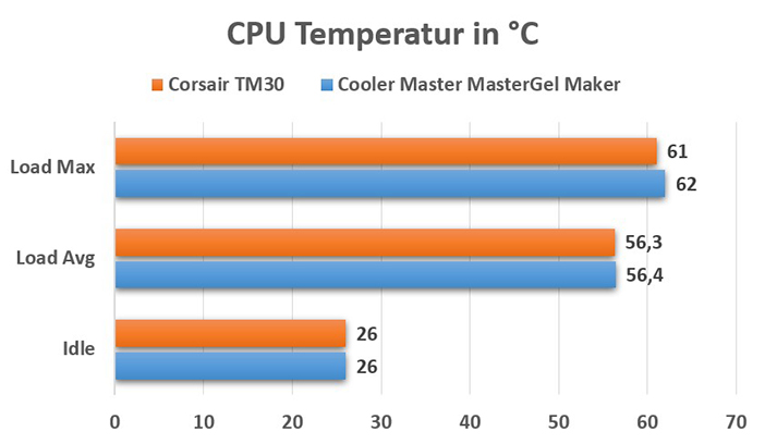 Die Corsair TM30 hielt unseren Intel Core i7 6700K, in der 30 minütigen Vollastsituation in Kombination mit einer NZXT Kraken X62, auf einer durchschnittlichen Temperatur von 56,3°C mit einem Maximalwert von 61°C. Diese Werte sind im Vergleich zu einer preislich ähnlichen Wärmeleitpaste minimal besser und können damit definitiv überzeugen.