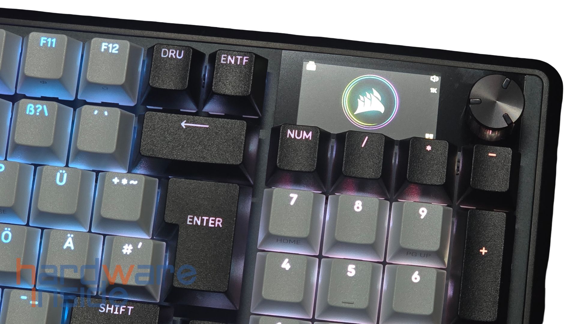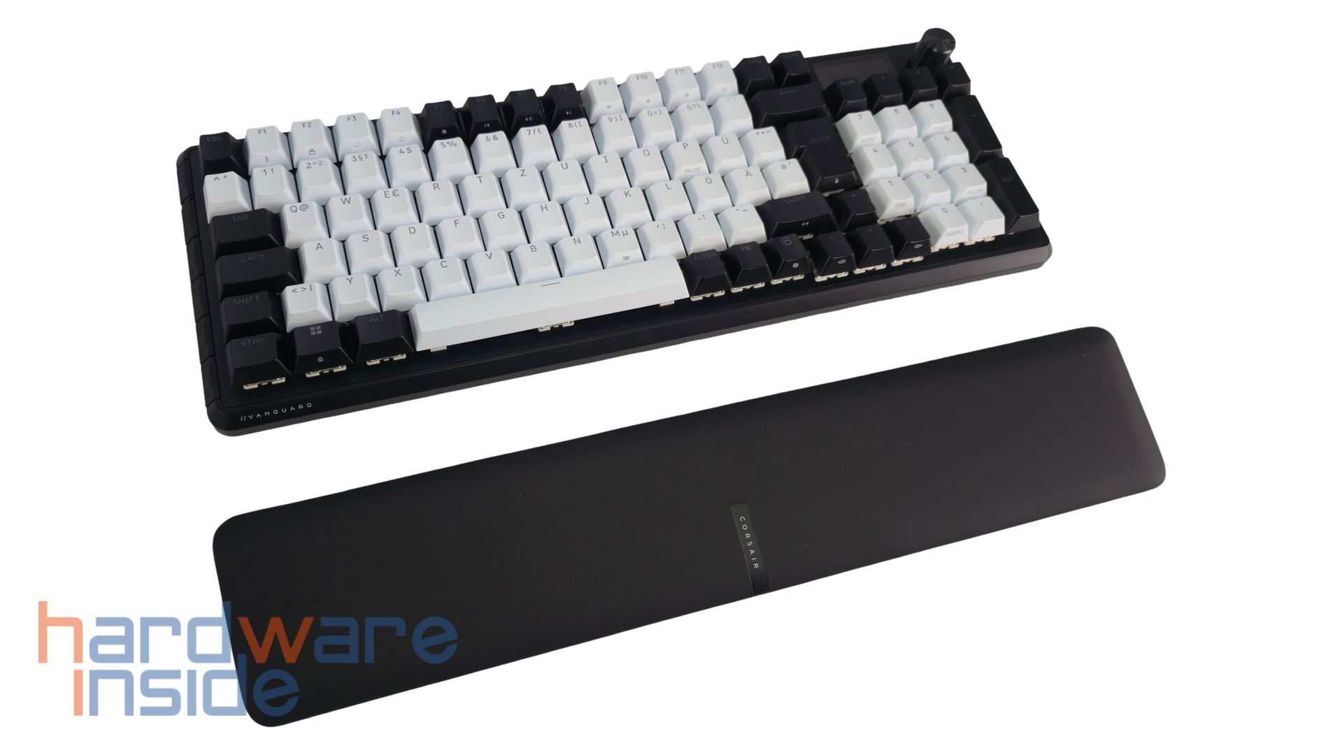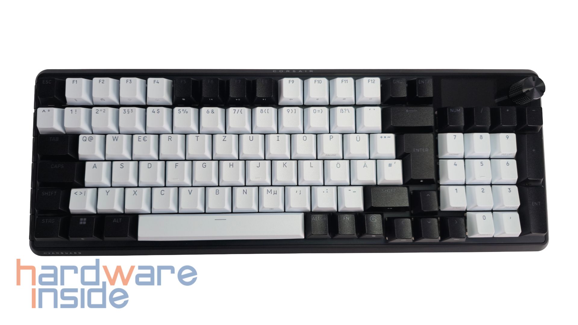 Die Tasten der CORSAIR VANGUARD 96 haben eine schwarz-weiße Oberfläche, die ganz fein angeraut ist. Der Korpus wird gut ausgenutzt, sodass der Rand der Tastatur schmal erscheint und ist in Schwarz gehüllt. Der Großteil der Tasten hat ein weißes Design, der Rest ist in Schwarz getaucht. Die einzelnen Tasten haben unbeleuchtet eine graue Aufschrift. Das Layout der Tastatur entspricht dem deutschen QWERTZ-Format. Schön zu sehen, ist der Nummernblock, der ebenfalls teils schwarz und teils weiß designt ist. Über dem Nummernblock ist ein aus Metall gefräster Drehknopf platziert. Daneben ist ein kleines Display eingearbeitet. Neben den etlichen FN-Shortcuts gibt es noch an der linken Kante der Tastatur sechs weitere Hebel. An der unteren und an der oberen Kante sind noch weiße Schriftzüge des Herstellers und des Modells zu finden.