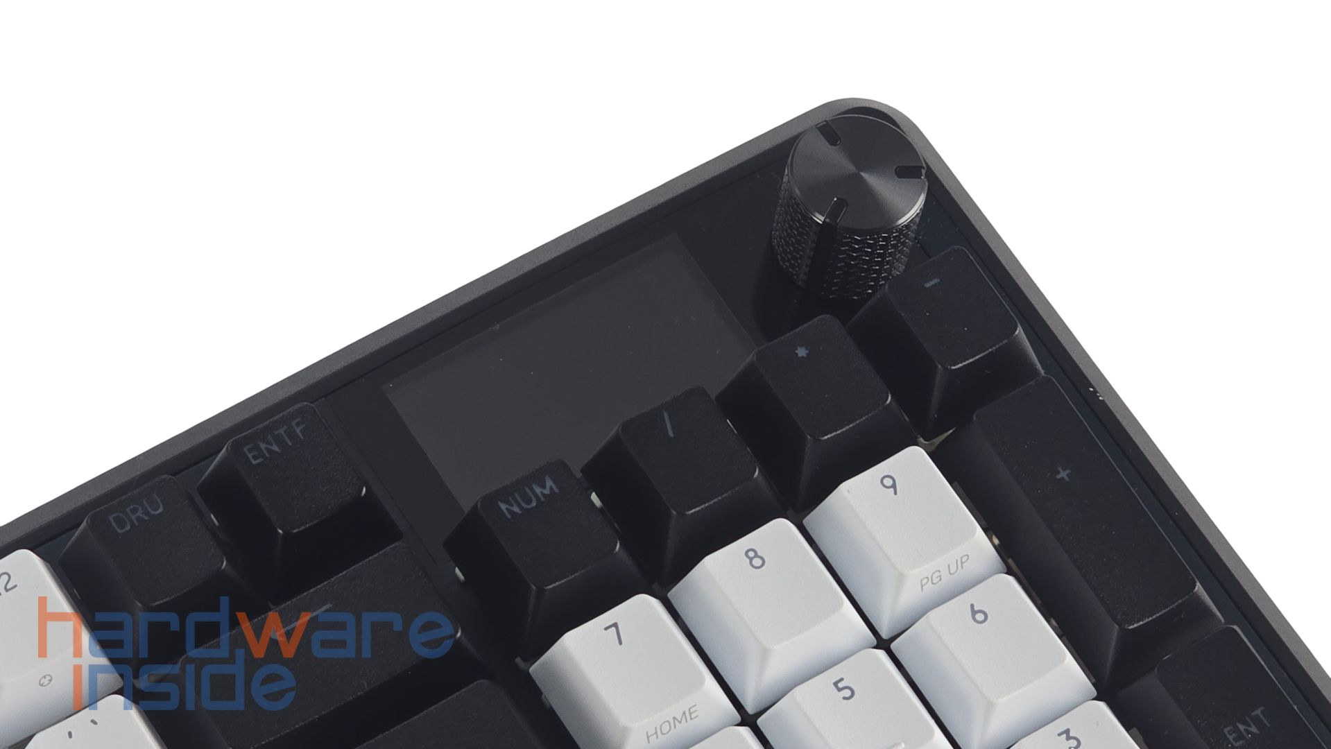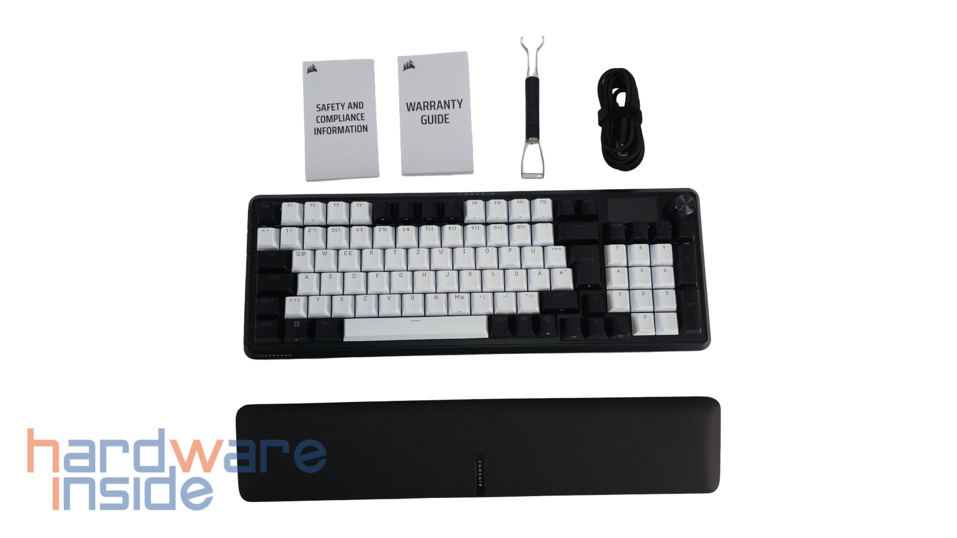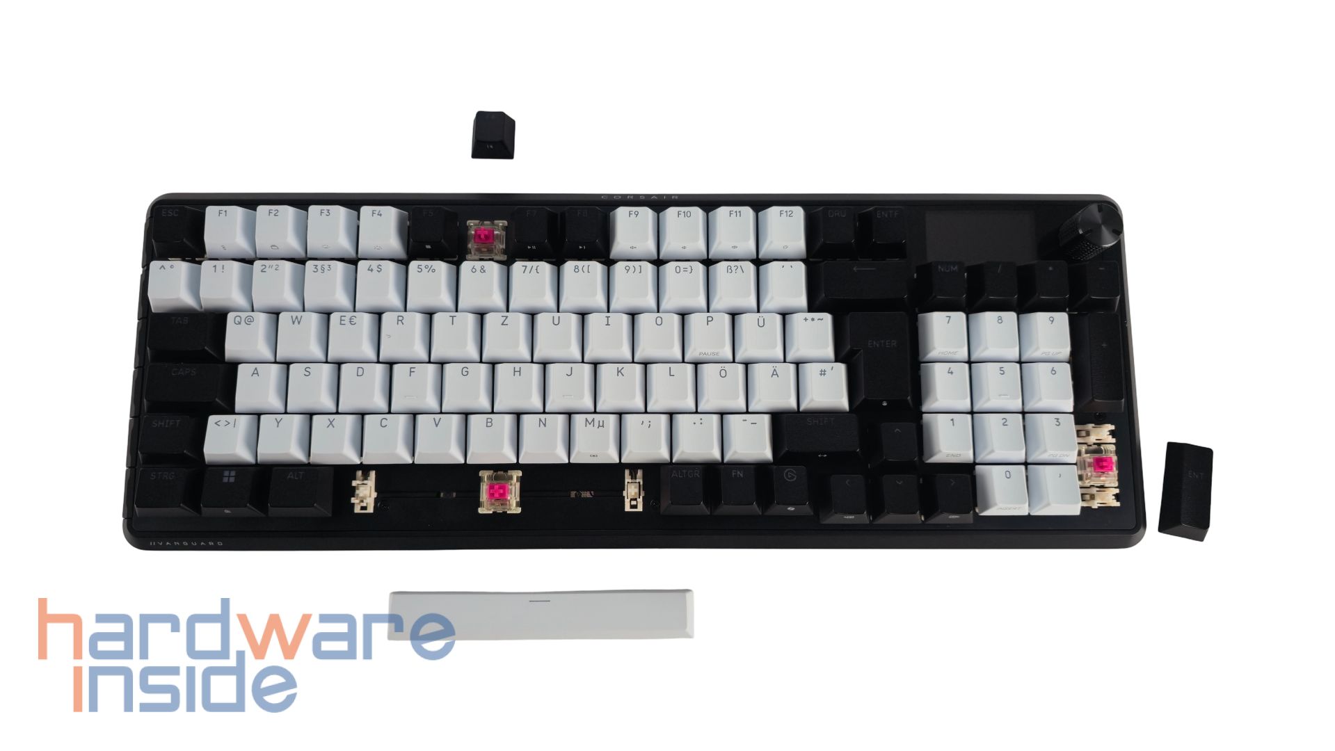 Die Tasten der CORSAIR VANGUARD 96 haben eine schwarz-weiße Oberfläche, die ganz fein angeraut ist. Der Korpus wird gut ausgenutzt, sodass der Rand der Tastatur schmal erscheint und ist in Schwarz gehüllt. Der Großteil der Tasten hat ein weißes Design, der Rest ist in Schwarz getaucht. Die einzelnen Tasten haben unbeleuchtet eine graue Aufschrift. Das Layout der Tastatur entspricht dem deutschen QWERTZ-Format. Schön zu sehen, ist der Nummernblock, der ebenfalls teils schwarz und teils weiß designt ist. Über dem Nummernblock ist ein aus Metall gefräster Drehknopf platziert. Daneben ist ein kleines Display eingearbeitet. Neben den etlichen FN-Shortcuts gibt es noch an der linken Kante der Tastatur sechs weitere Hebel. An der unteren und an der oberen Kante sind noch weiße Schriftzüge des Herstellers und des Modells zu finden.