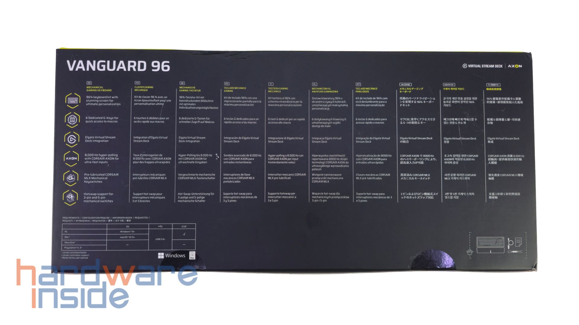 Die Verpackung der CORSAIR VANGUARD 96 hat die typischen Farben des Herstellers in Gelb und in Schwarz. Auf dem Karton ist links oben der Hersteller und rechts oben der Modellname abgebildet. Die Tastatur ist aus der Drauf-Sicht abgebildet, wobei das Design der VANGUARD aus schwarz und weiß zum Vorschein kommt. Auf der Rückseite der Kartonage sind die Features in verschiedenen Sprachen und die Kompatibilität aufgelistet. An den Seiten der Verpackung ist weiterhin ein Blick auf die Tastatur durch kleinere Abbildung möglich.