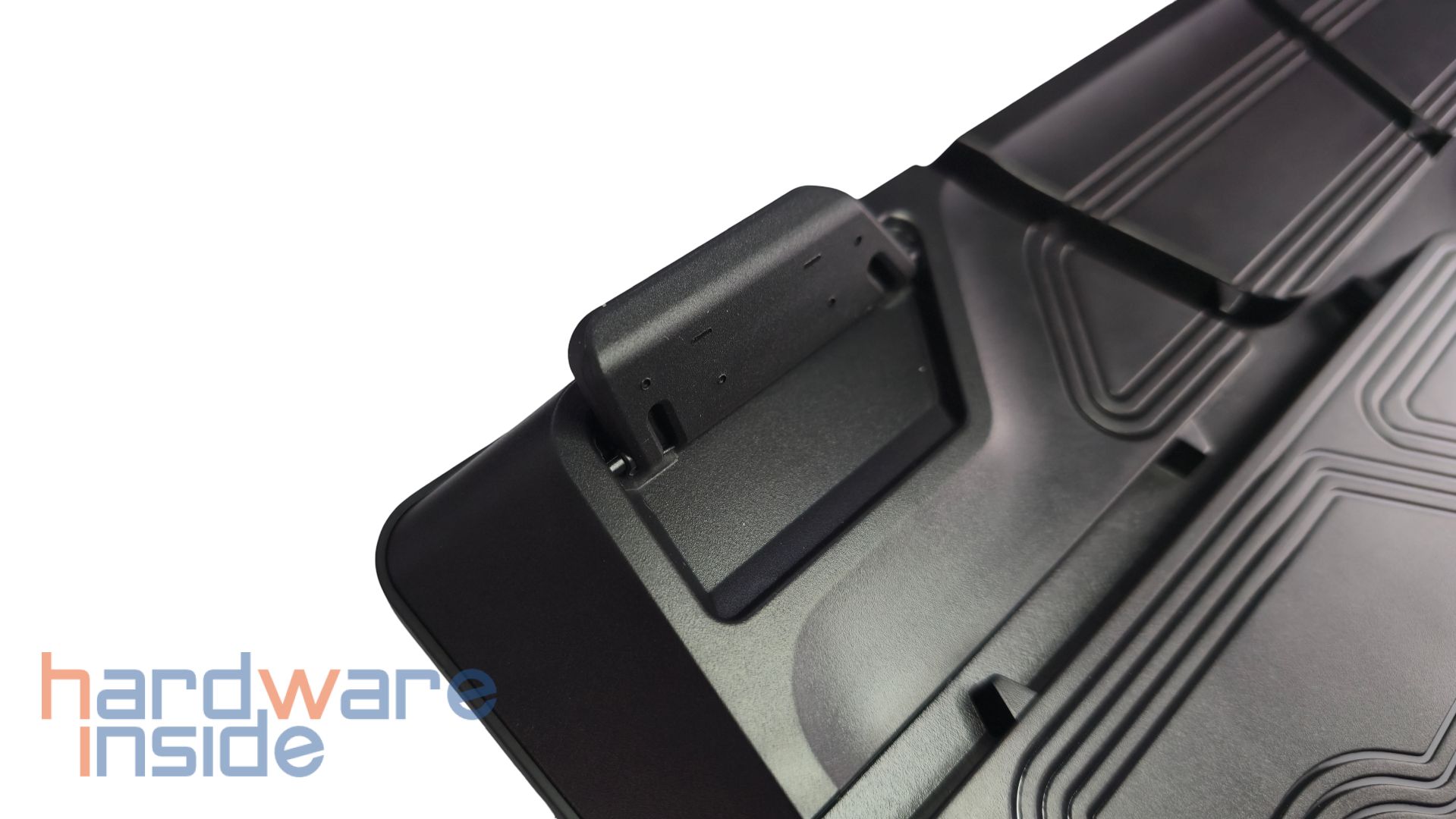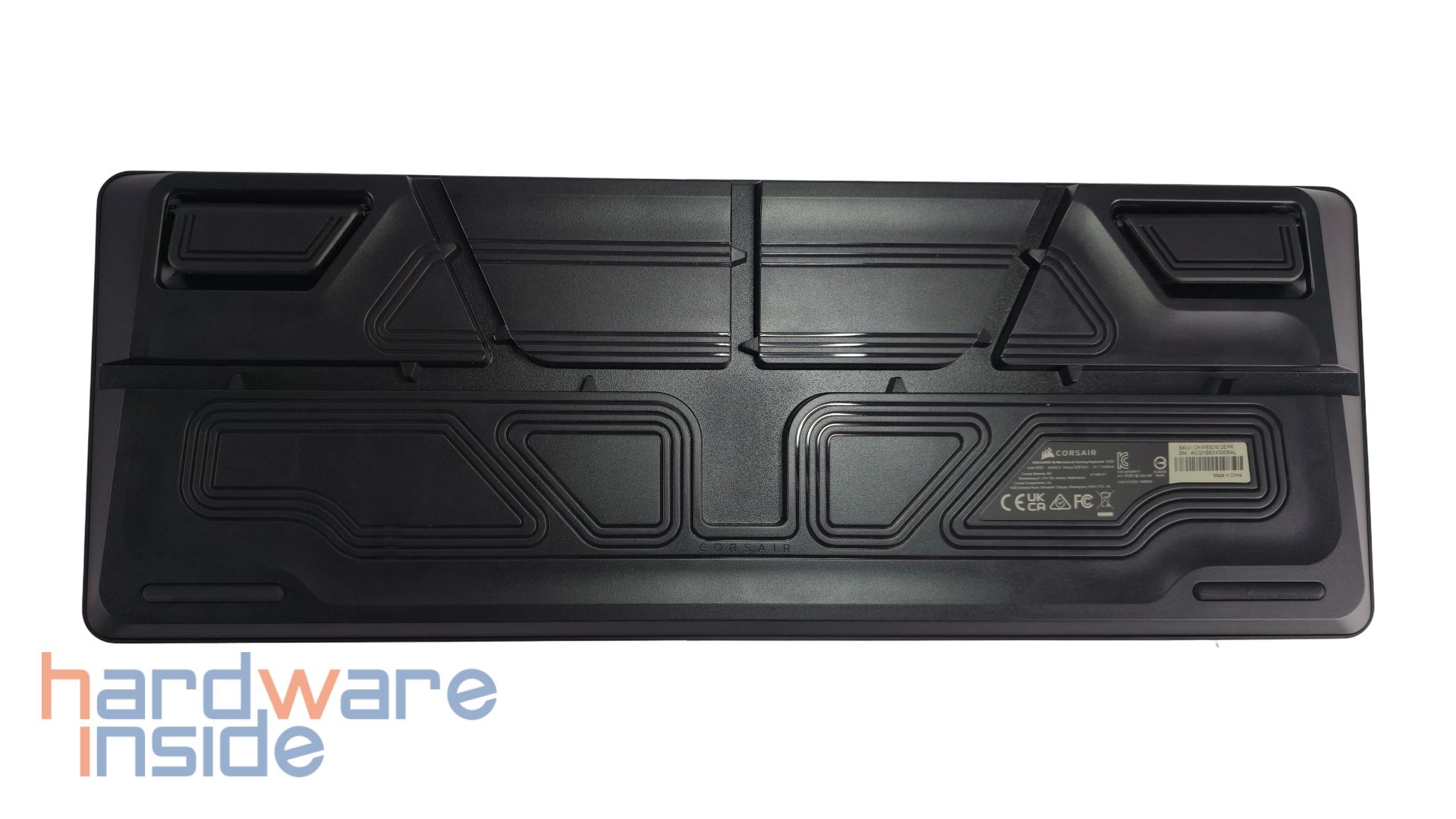 Die Unterseite der Tastatur besitzt konzentrische Designelemente mit Kabelkanälen zum Verlegen der USB-C-Zuleitung. Der USB-C-Anschluss befindet sich hier mittig im unteren Bereich anstatt an der Oberkante, wie von anderen Tastatur-Modellen gewohnt. An den oberen Ecken der Unterseite sind zwei ausklappbare Füße zur Erhöhung der CORSAIR VANGUARD 96. Die unteren Ecken haben zwei längliche Gummi-Füße für eine Anti-Rutsch-Wirkung. Zuletzt sind noch Zertifikate, kurze elektrotechnische Daten und Seriennummern auf der Rückseite zu finden.