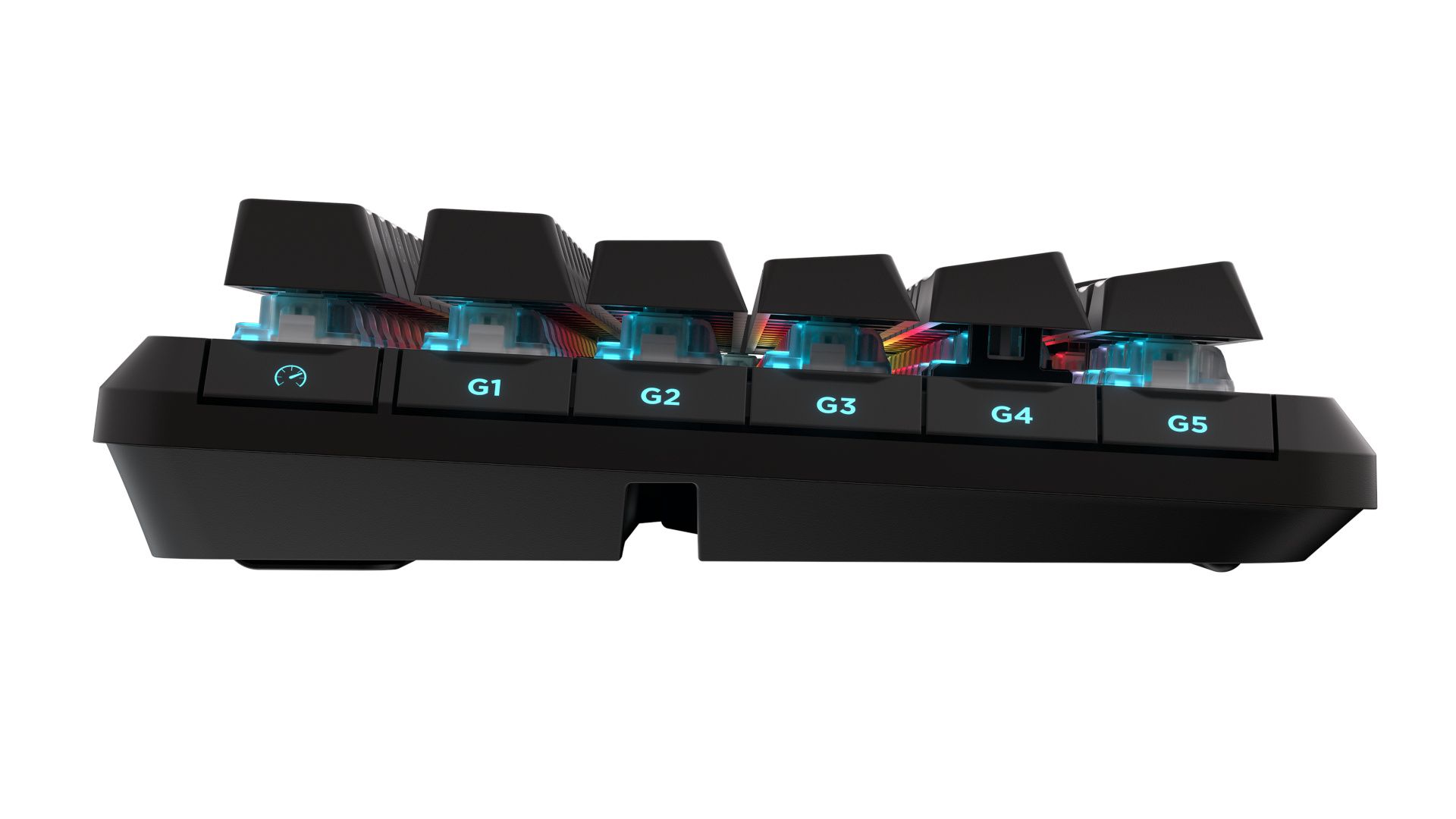 Die erste Taste der G-Hebel stellt den Gaming-Modus an. Hier wird die Beleuchtung auf Rot gewechselt und die Windows-Taste deaktiviert – mit einem Druck in den Feierabendmodus! Das Design der G-Tasten ist so gewählt, dass diese leicht betätigt werden, aber nicht aus Versehen gedrückt werden können.