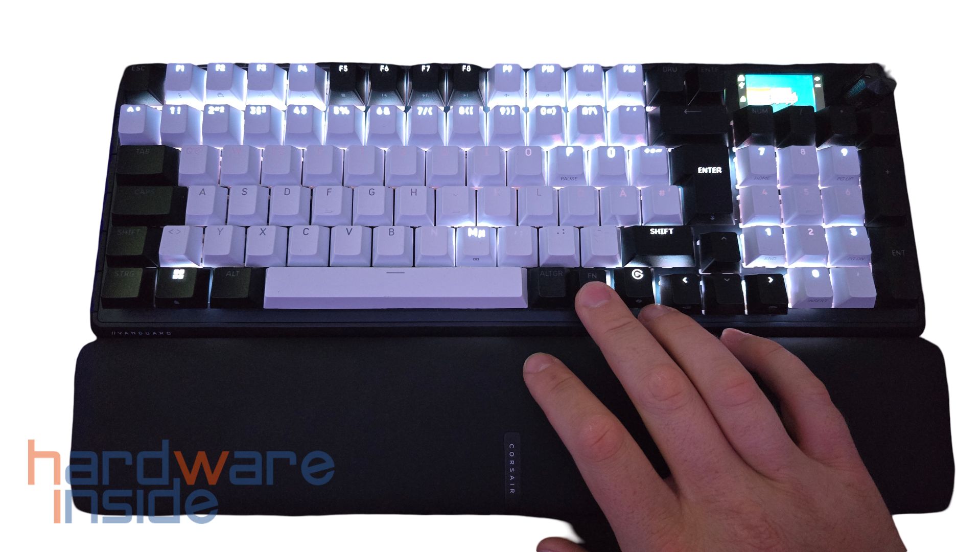 Die CORSAIR VANGUARD 96 wird am Schreibtisch aufgestellt und durch ausklappbare Füße erhöht. Das ummantelte USB-C-Kabel wird in der Hinterseite eingesteckt und entsprechend der Kabelführung verlegt. Die Handballenauflage wird in die Nähe der Unterkante der Tastatur gebracht und wird magnetisch gehalten. Das USB-C-Kabel wird an den PC angeschlossen und kann per Plug & Play genutzt werden. Das Erste, was uns auffällt, ist die kontrastreiche Beleuchtung, vor allem zwischen den schwarzen und den weißen Tasten. Jedes Symbol und jede Zahl ist bei allen Umgebungsleuchtstärken gut sichtbar, auch bei niedrigster Beleuchtungsstufe – es entsteht eine angenehme Arbeits- oder Gaming-Atmosphäre. Das Thema der Beleuchtung gilt auch für die seitlichen G-Hebel, denn diese sind auch einzeln ausgeleuchtet. Der zweite Blick gebührt dem Display, das nun einige Symbole zeigt und mittig das Corsair-Logo in violett, blau und grün darstellt.