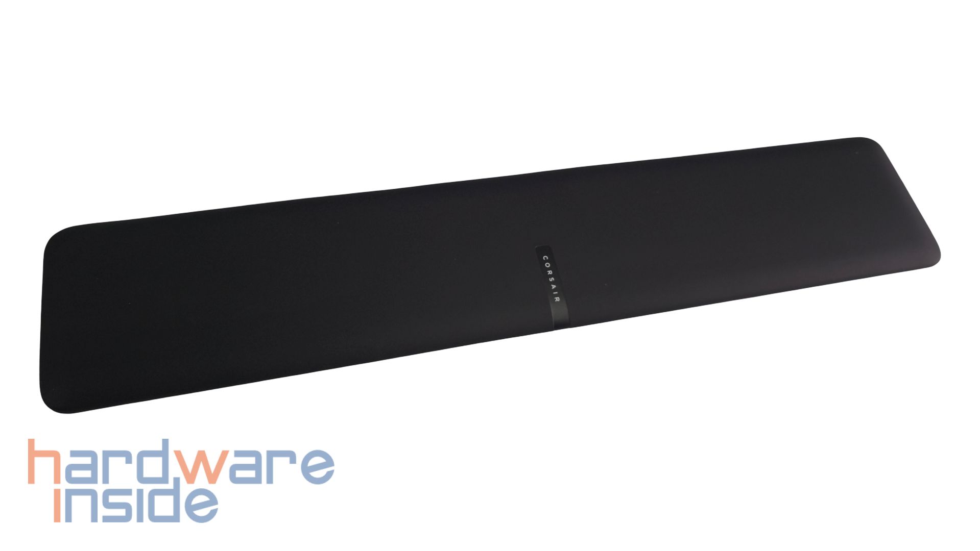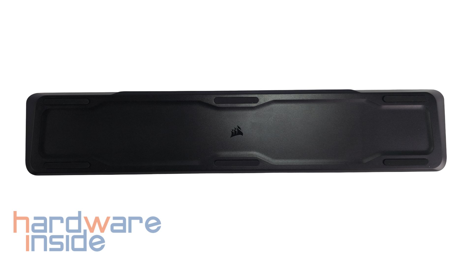 Die Handballenablage ist komplett schwarz und besitzt eine sehr glatte und angenehme Oberfläche. Mittig auf der oberen Seite ist ein CORSAIR-Schriftzug eingearbeitet. Das Kissen scheint silikonartig bzw. aus Kunststoff zu bestehen. Die Unterseite zeigt den Korpus aus hartem Kunststoff mit sechs länglichen Anti-Rutsch-Pads und einem mittig platzierten CORSAIR-Logo. Die Handballenauflage wird magnetisch und stabil an der Unterkante der CORSAIR VANGUARD 96 gehalten.