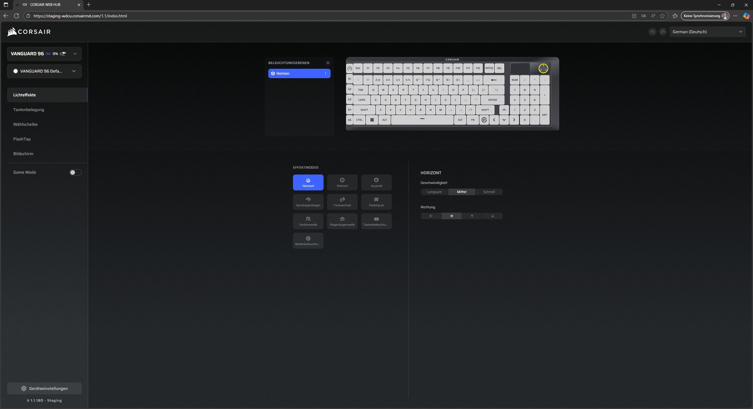 Die RGB-Beleuchtung der CORSAIR VANGUARD 96 ist atemberaubend. Stilistisch behält der Hersteller sein Design der milden und doch präzisen Beleuchtung mit vielen verschiedenen Lichteffekten, die im CORSAIR WEB HUB angepasst werden können. Das WEB HUB ist nicht unbedingt nötig, denn man kann die Beleuchtungseffekte durch die FN-Taste in Kombination mit den Zahlentasten anpassen. Die Integration in iCUE wird voraussichtlich nicht lange auf sich warten. Nicht nur die Beleuchtung ist herausragend, die Krönung wird nämlich mit dem integrierten Display aufgesetzt. Eine Hand voll vorgefertigte Hintergründe stehen zur Auswahl, die durch eigene GIFs und Bilder ersetzt werden können. Dabei sind Statussymbole zur Lautstärke, Polling-Rate, Beleuchtung, Win-Lock, Nummernblock und andere zu sehen. Auch die G-Tasten an der Seite werden einzeln mit den Effekten beleuchtet.