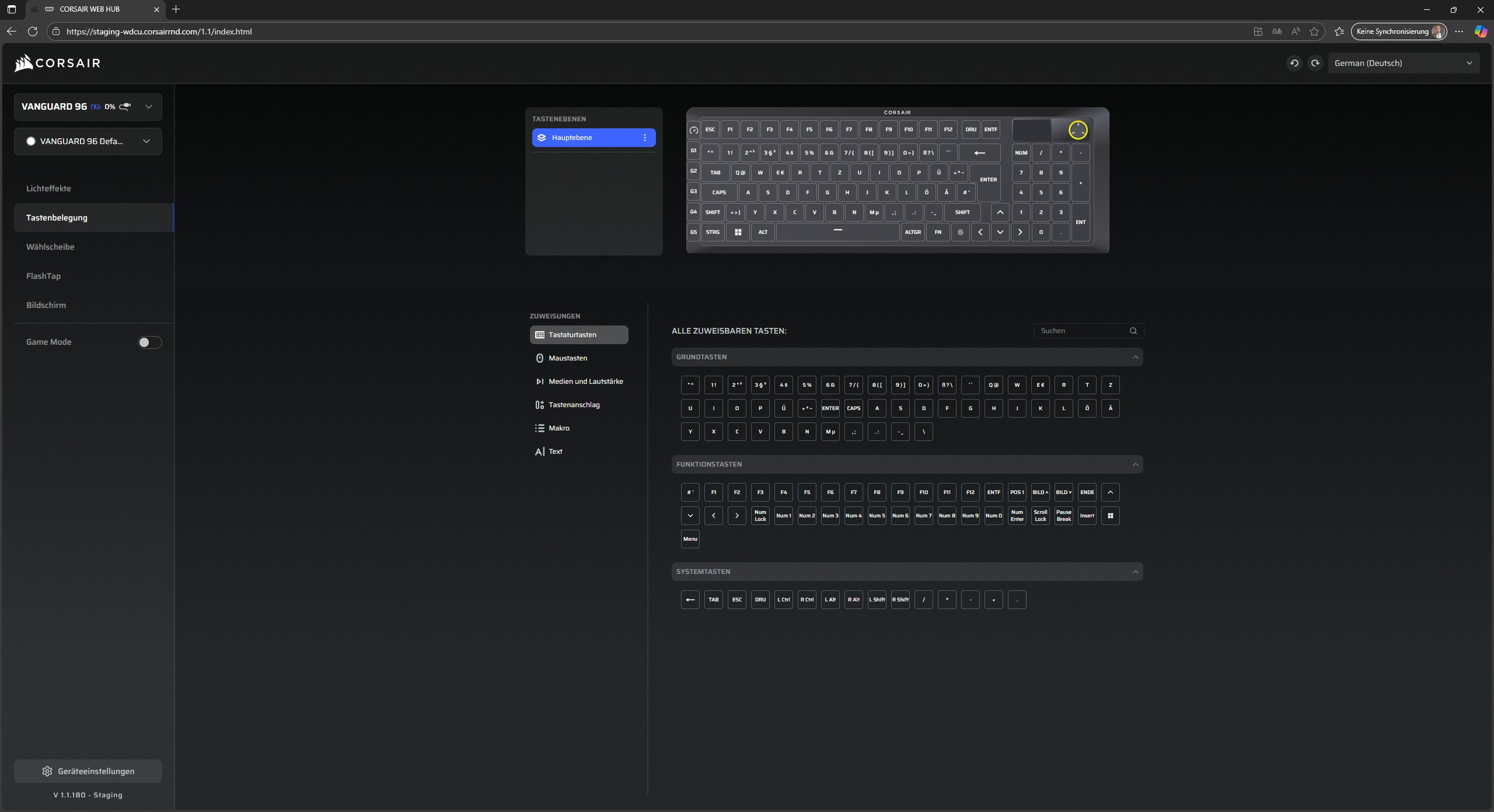 Im Register Tastenbelegung können, wie von iCUE gewohnt, alle Tasten bearbeitet und mit verschiedenen Funktionen und Makros ausgestattet werden. Für eine leichte Übersicht sorgt die Aufteilung in Grundtasten, Funktionstasten und Systemtasten. Besonders interessant sind hier die Einstellungen für die G-Tasten, die beliebig angepasst werden können. Hier kann der Kreativität freien Lauf gelassen werden.