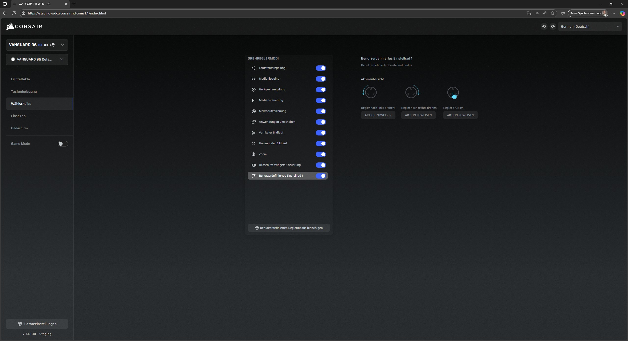 Die Wählscheibe verspricht auch nicht zu wenig – eine Menge Funktionen können hier für das Drehrad rechts oben angewählt werden. Auch eigene Funktionen können hier zum Drücken und Drehen des Rads zugewiesen werden. Möchte man andere Funktionen einbetten, aber die alten Makros nicht löschen, ist dies kein Problem – diese werden einfach aktiviert oder deaktiviert.