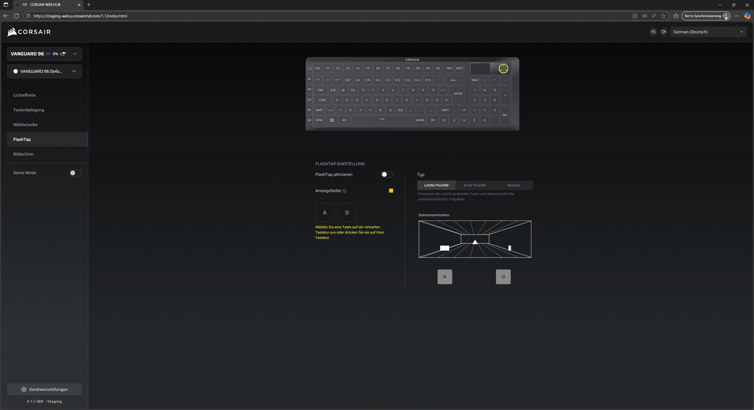 Die FlashTap-Technologie erlaubt die entgegengesetzte Bewegung in Spielen. So können die erste, letzte oder keine der Eingaben priorisiert werden, was besonders einen Vorteil bei Bewegungen um Ecken erlaubt. Standardmäßig ist dieses Feature deaktiviert, da es sein kann, dass manche Spiele das als Cheat erkennen könnten. Am besten wird das im CORSAIR WEB HUB klar, denn dort wird die Funktion visualisiert.