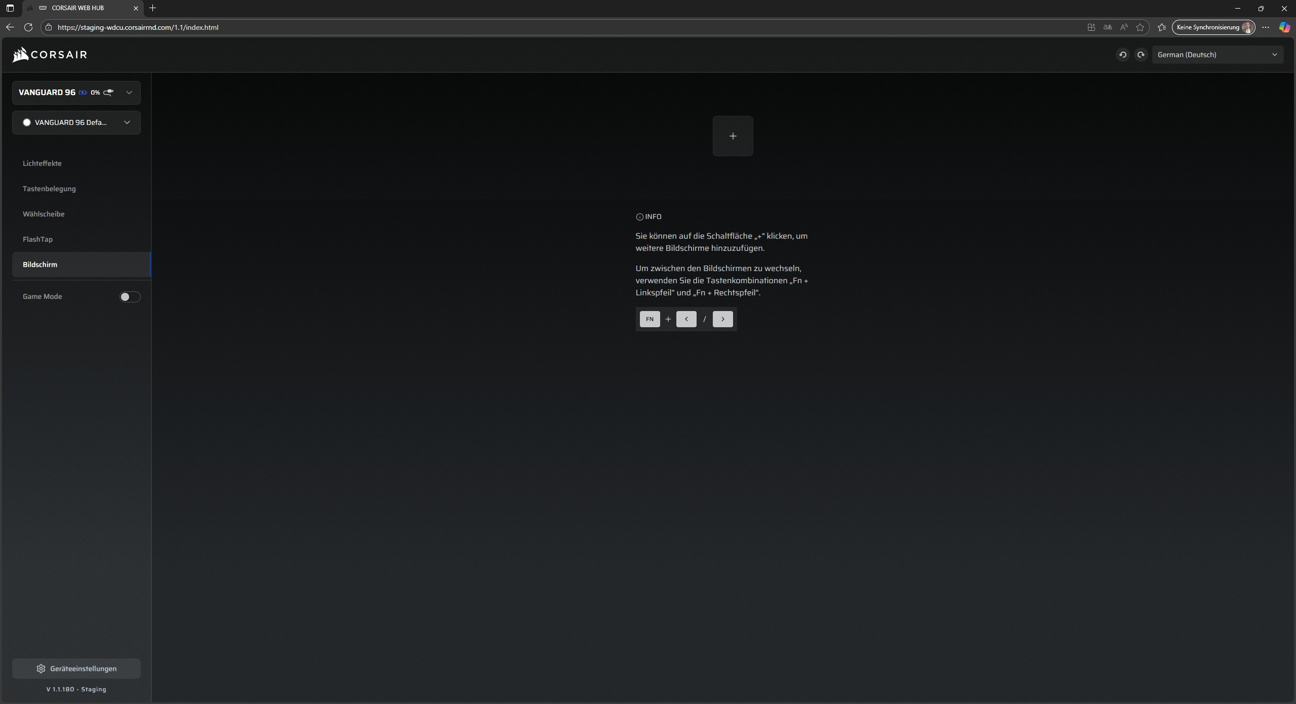 Das Register Bildschirm können Gifs und Bilder auf das kleine Display der Tastatur geladen werden. Hier sollten die Dateien keine Größe von 500 KB überschreiten, worauf beim Hochladen hingewiesen wird. Als kurze Information wird hier noch die Tastenkombination illustriert, welche es erlaubt, zwischen den Dateien umzuschalten.