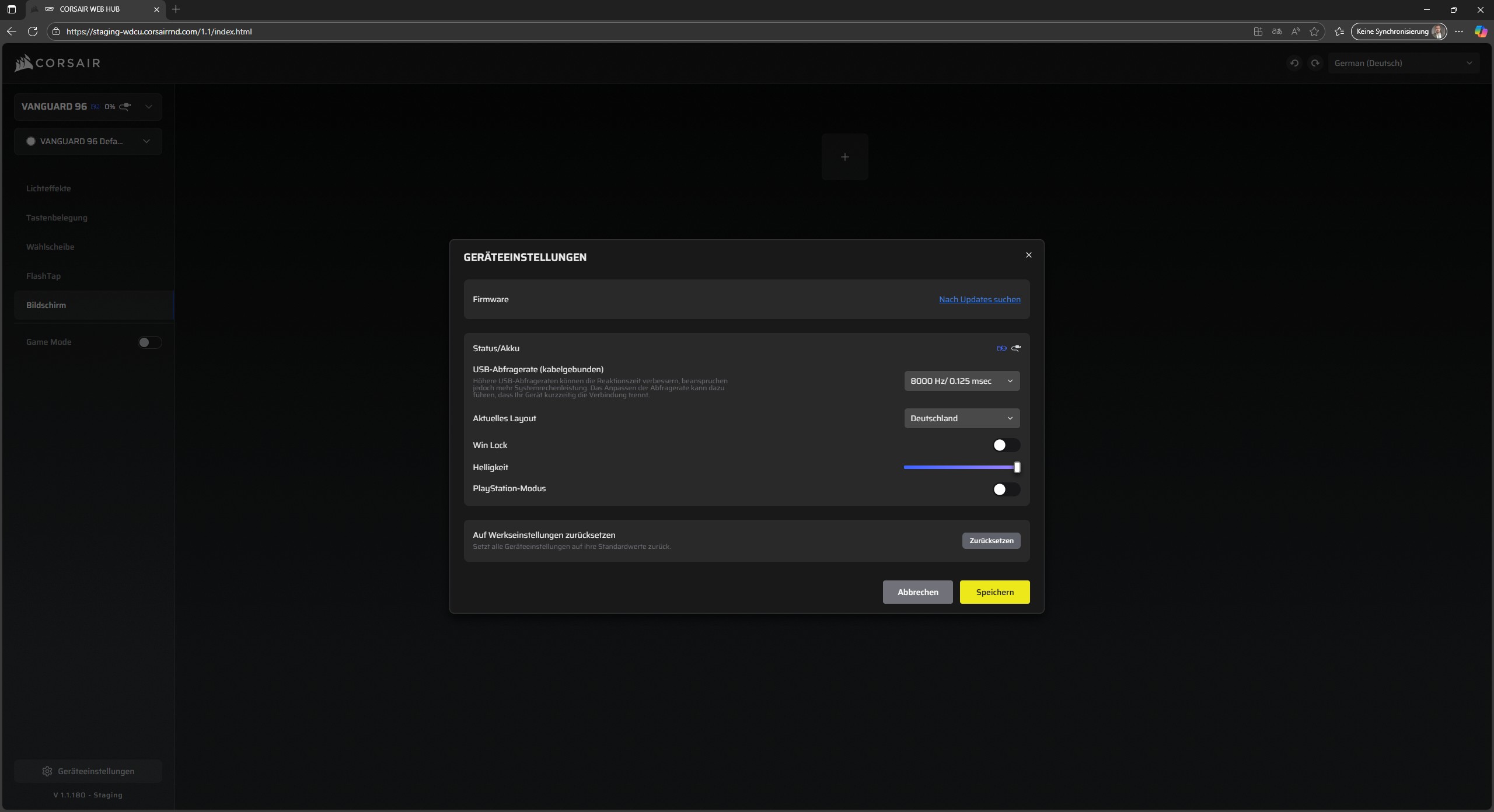 Zuletzt finden wir am unteren linken Rand die Geräteeinstellungen, über die wir nach neuer Firmware suchen, die Polling-Rate einstellen, das Layout anpassen, Win-Lock aktivieren, die Helligkeit justieren, den Playstation-Modus einschalten und das Gerät auf Werkseinstellungen zurücksetzen können.