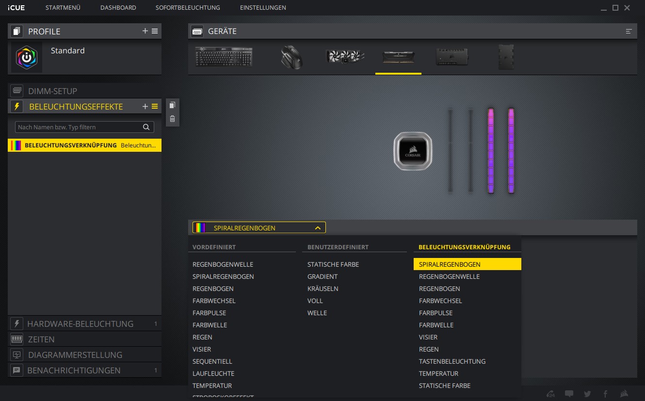 Dem Nutzer stehen in Bezug auf die Beleuchtung umfangreiche Anpassungsmöglichkeiten zur Verfügung. Eine Synchronisierung mit anderen Corsair Produkten ist problemlos möglich. Pro Modul können die 10 RGB-LEDs individuell den Wünschen eingestellt werden.