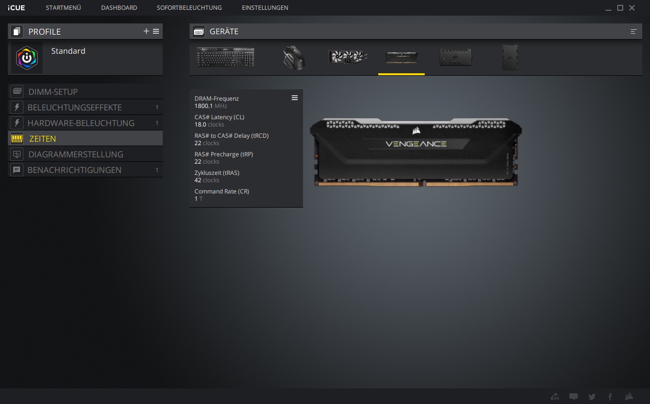 Möchte man einen Einblick auf die aktuelle Konfiguration erhalten, so listet iCUE unter dem Menüpunkt „Zeiten“ die DRAM-Frequenz und die wichtigsten eingestellten Zeiten des Arbeitsspeichers auf. Die Standardwerte der Module betragen in unserem Fall, wie auf dem Bild zu sehen ist, 3600 MHz mit Zeiten von 18-22-22-42.