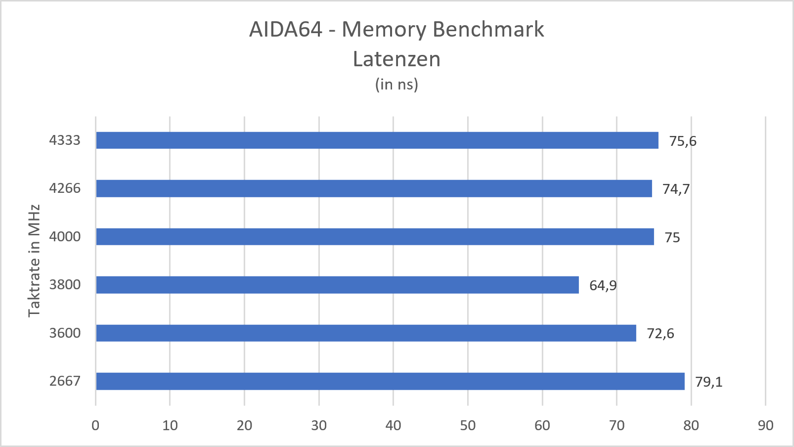 Als Sweetspot in Bezug auf die Latenzen ergab sich mit 64,0 ns bei unseren Modulen bei einer Frequenz von 3800 MHz mit einer 18-22-22-42 Konfiguration. Eine Verbesserung der Werte ist mit Sicherheit mit noch spitzeren Timings durch manuelle Anpassung möglich. Unsere Einstellungen sollten stabile und komplikationsfreie Konfigurationen darstellen.