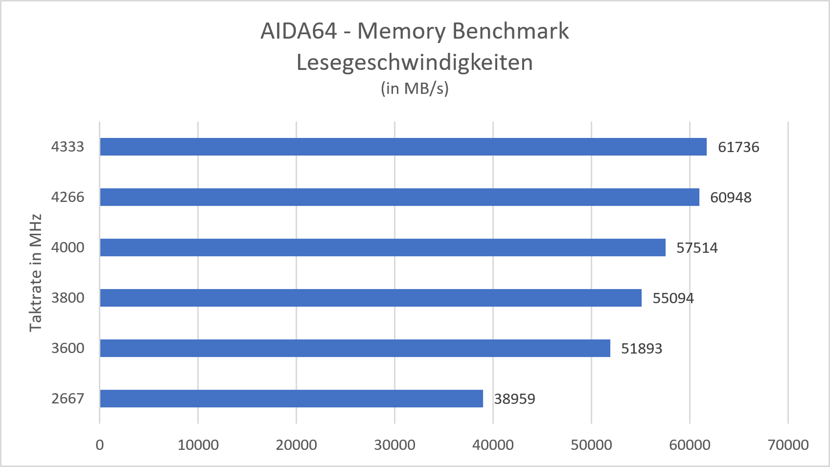 Beim initialen Start nach der Installation der beiden RAM-Riegel ergab sich ein Takt von 2667 MHz. Um aufzuzeigen, was für ein deutlicher Unterschied sich alleine im Vergleich zum XMP/D.O.C.P ergibt, haben wir die Testreihe mit aufgenommen. Eine deutliche Steigerung der Lesegeschwindigkeiten ergab sich ab dem XMP/D.O.C.P von 3600 MHz bis zu 4333 MHz mit insgesamt 19 % Mehrleistung in dieser Disziplin.